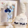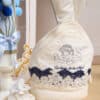 🕯️ Lumânare de botez – Lumânarea de botez are accente de catifea albastru, broderie aurie și panglici de satin și detalii strălucitoare, elemenetele îi aduc un plus de contrast și rafinament.
