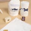 🕊️ Trusou de botez 9 piese – Tot ce ai nevoie într-un singur loc! Prosop cu capișon bebeluș, scutec bumbac cu capișon bebeluș, prosop preot, pânză de mir, fașă, săpun, sticluță mir decorată, cutiuță pentru prima șuviță și mini ramă “mărturie” – pentru poză bebeluș sau iconiță.