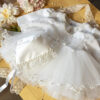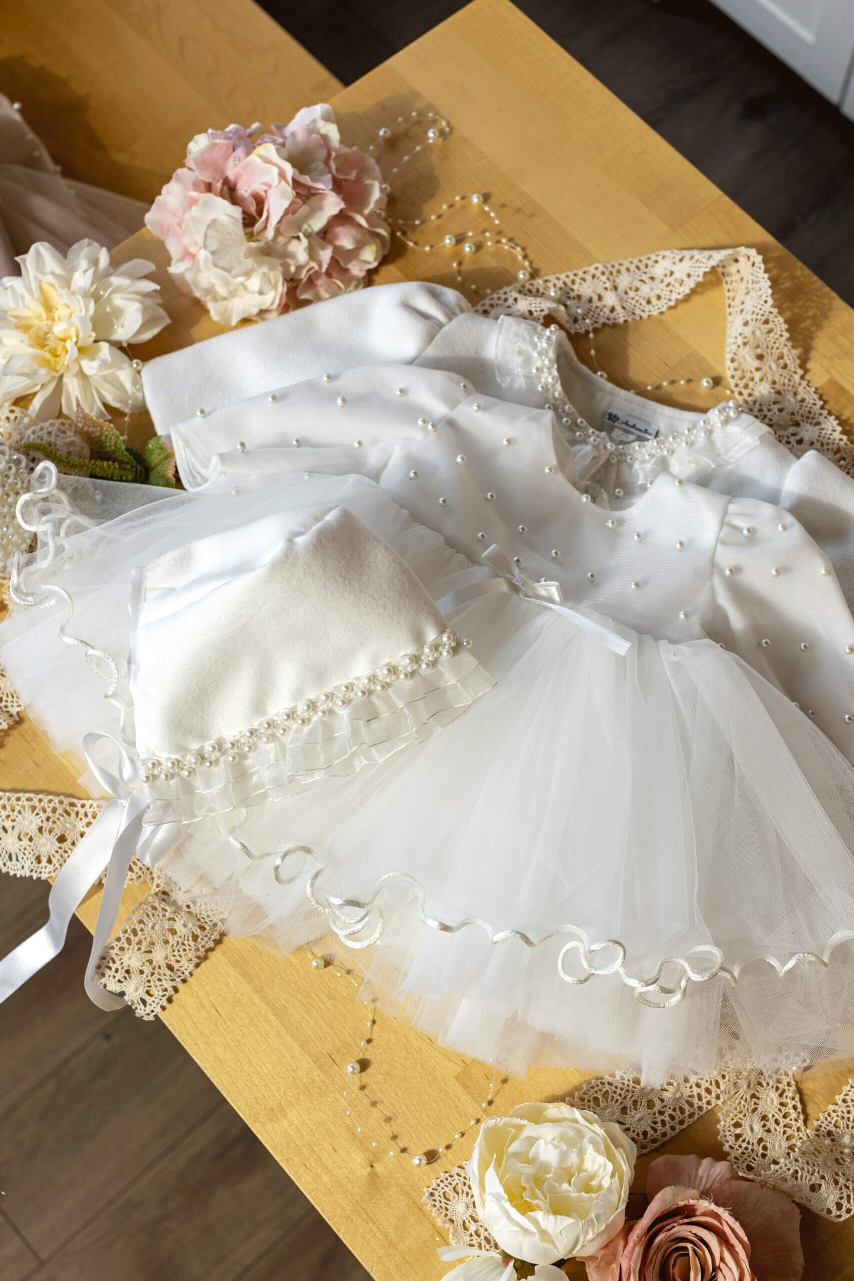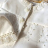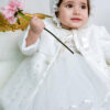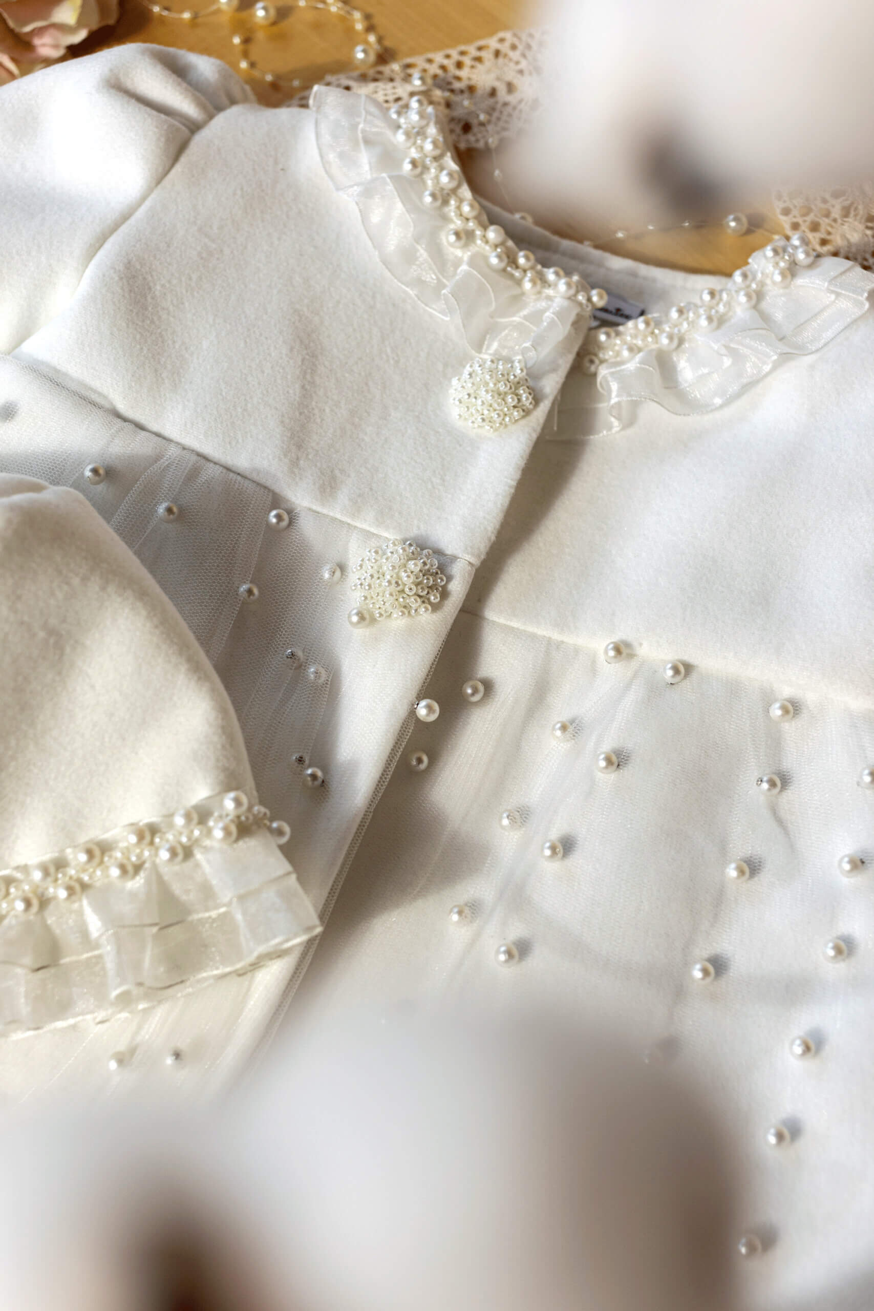 Paltonașul este confecționat cu grijă dintr-o stofă de calitate, combinată cu tull împodobit cu perle subtil.