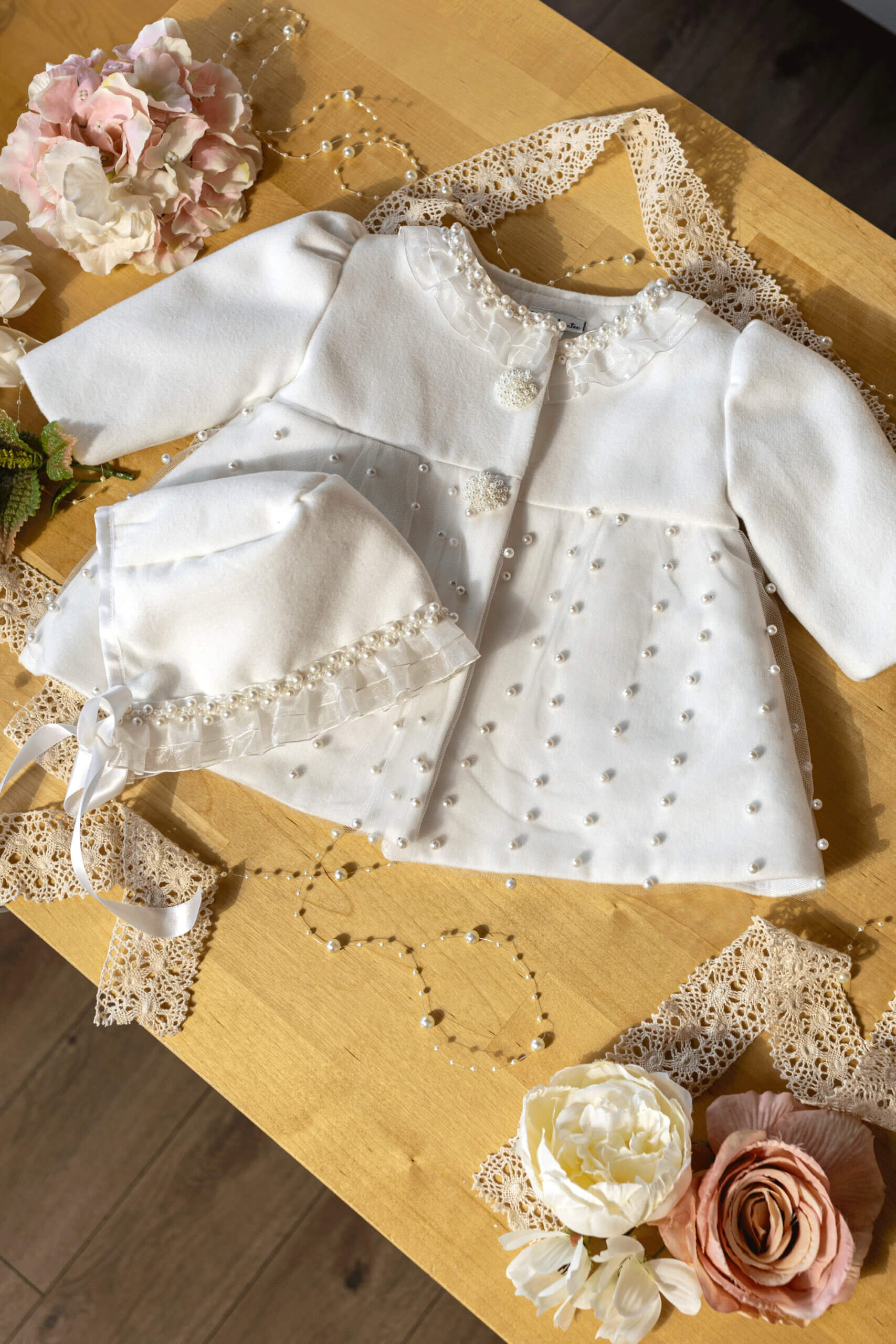 Compleul conține 3 piese: rochiță, pălărie, paltonaș