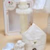 🕊️ Trusou de botez 9 piese – Tot ce ai nevoie într-un singur loc! Prosop cu capișon bebeluș, scutec bumbac cu capișon bebeluș, prosop preot, pânză de mir, fașă, săpun, sticluță mir decorată, cutiuță pentru prima șuviță și mini ramă “mărturie” – pentru poză bebeluș sau iconiță