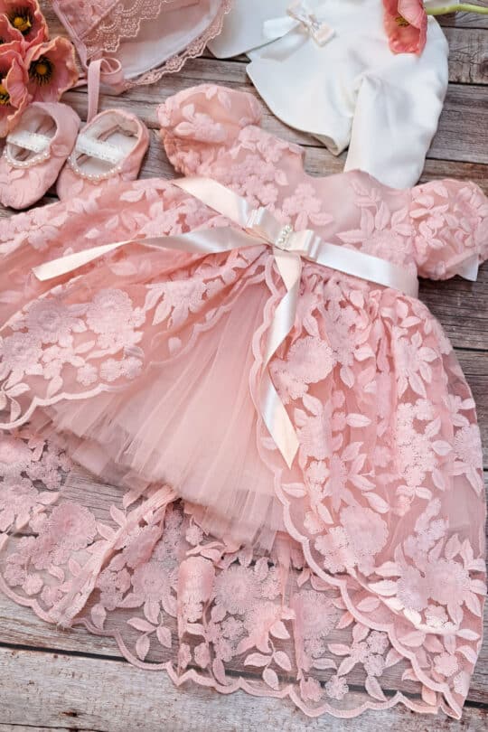 Introducând noul model Pauline, vă prezentăm un set elegant și rafinat, perfect pentru momentele speciale din viața micuței dumneavoastră.