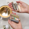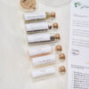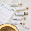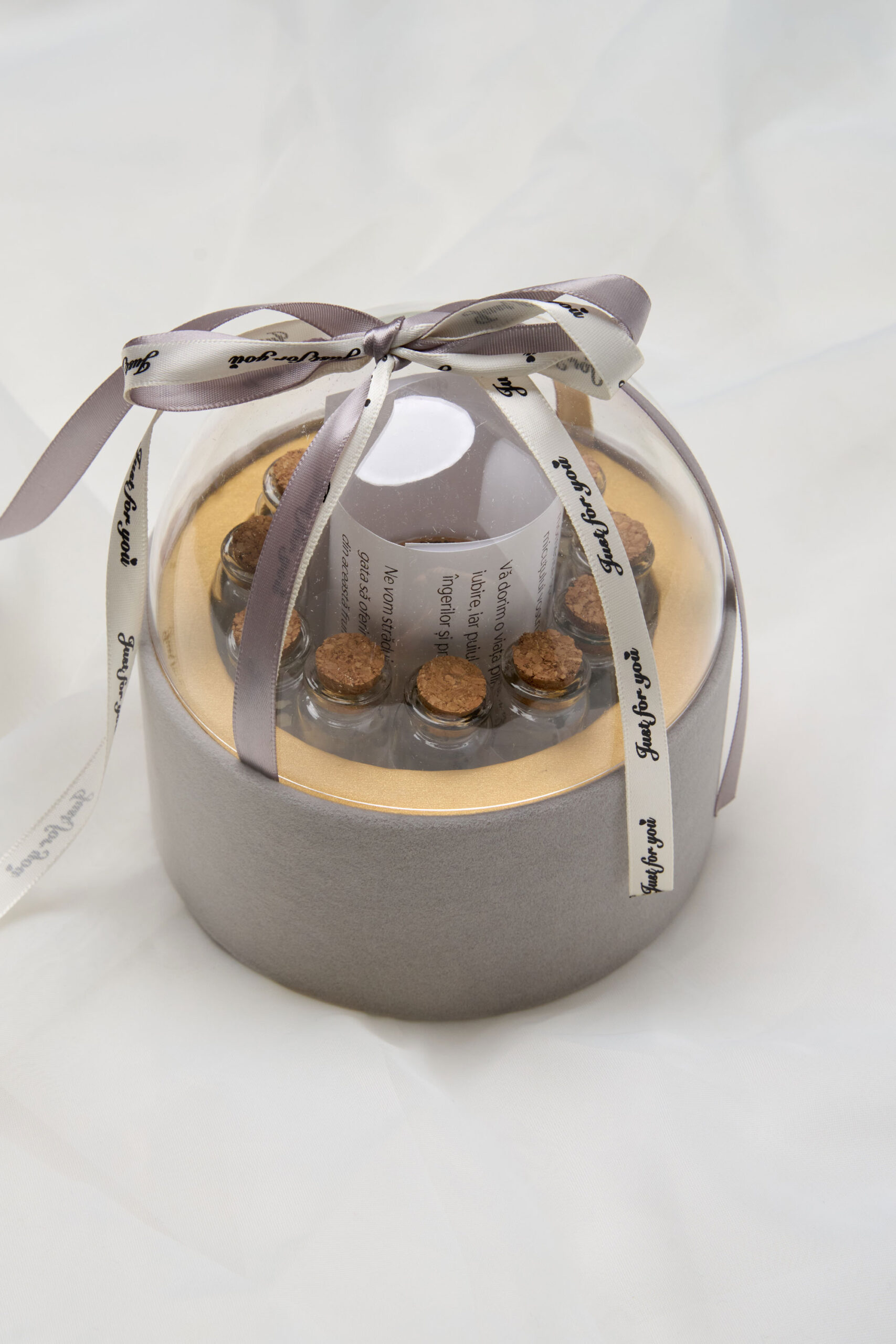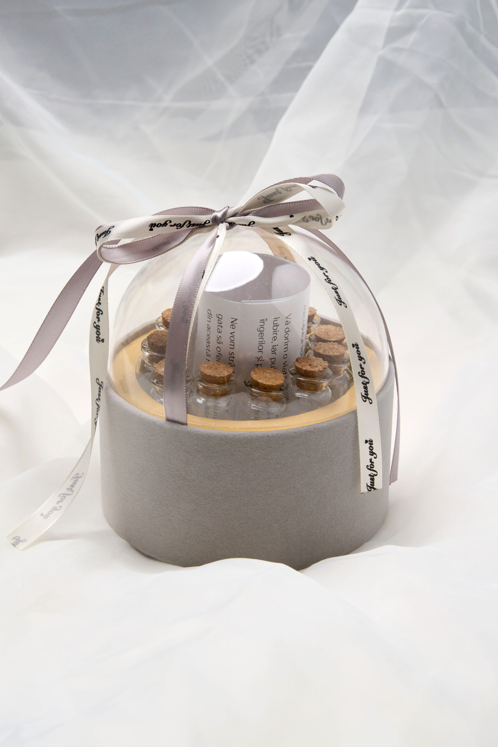 Setul vine într-o cutie rafinată, cu capac transparent, decorată cu o panglică fină și panglică roșie de satin, ideală pentru a fi oferită în dar cu ocazia primei băițe. Fiecare ingredient este ambalat în recipiente individuale, păstrând astfel esența și prospețimea fiecăruia.