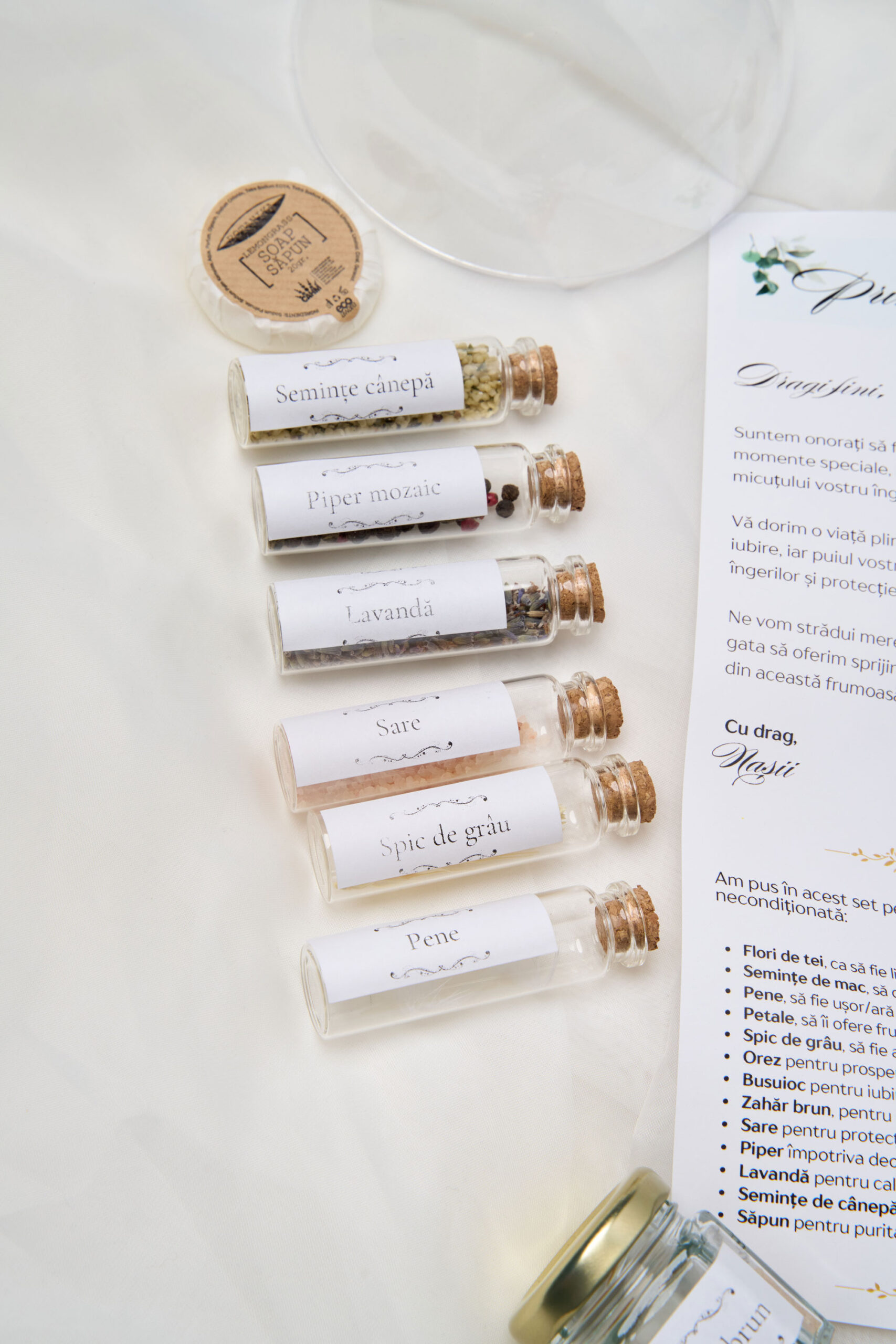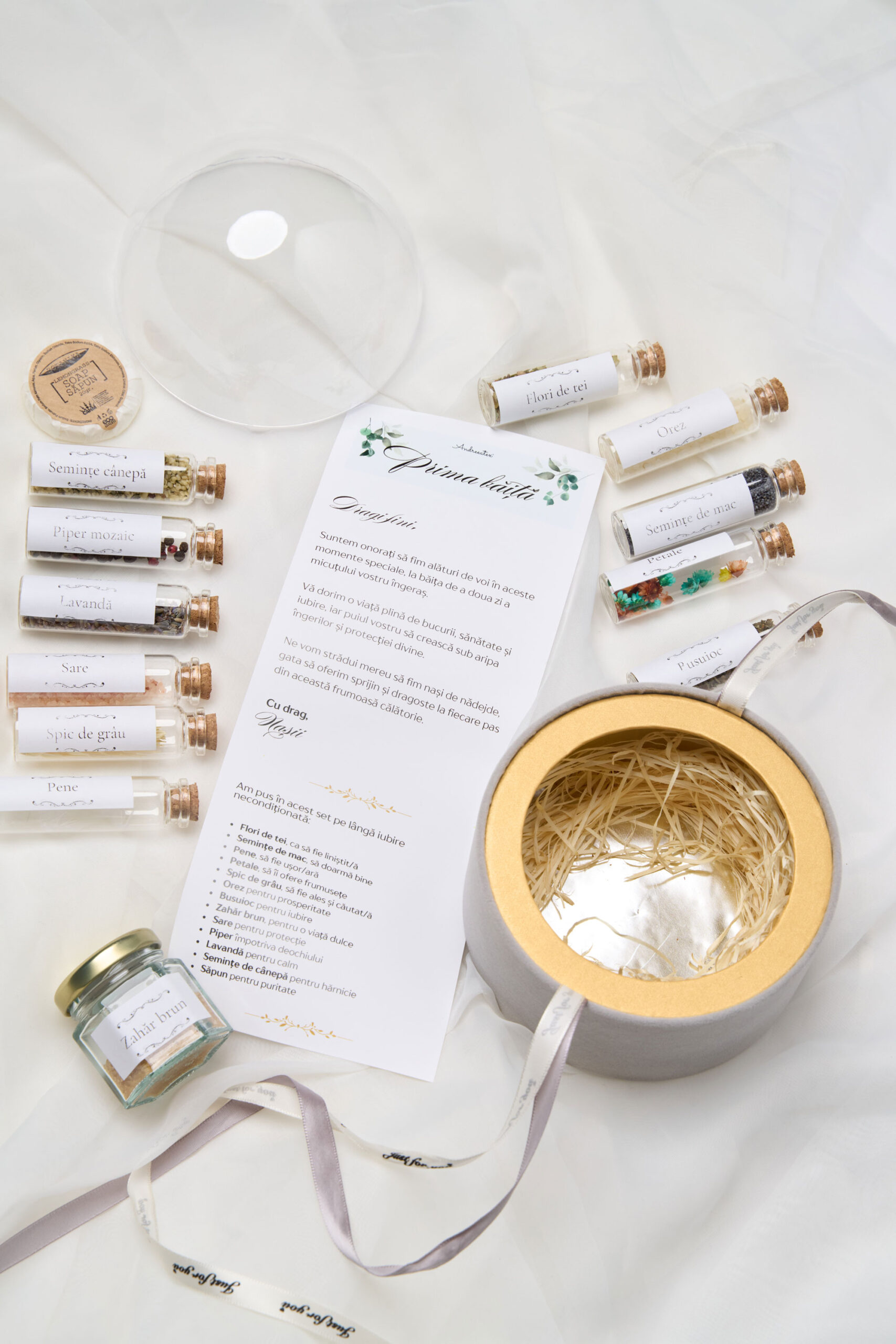Acest set special pentru “prima băiță” este creat pentru a marca un moment unic și plin de emoție în viața micuțului tău, alături de familie și nași. Setul include o colecție atent selectată de ingrediente naturale și simbolice, fiecare cu o semnificație aparte, inspirată din tradiții străvechi, menite să aducă sănătate, protecție și prosperitate copilului.
