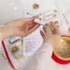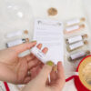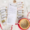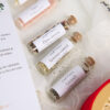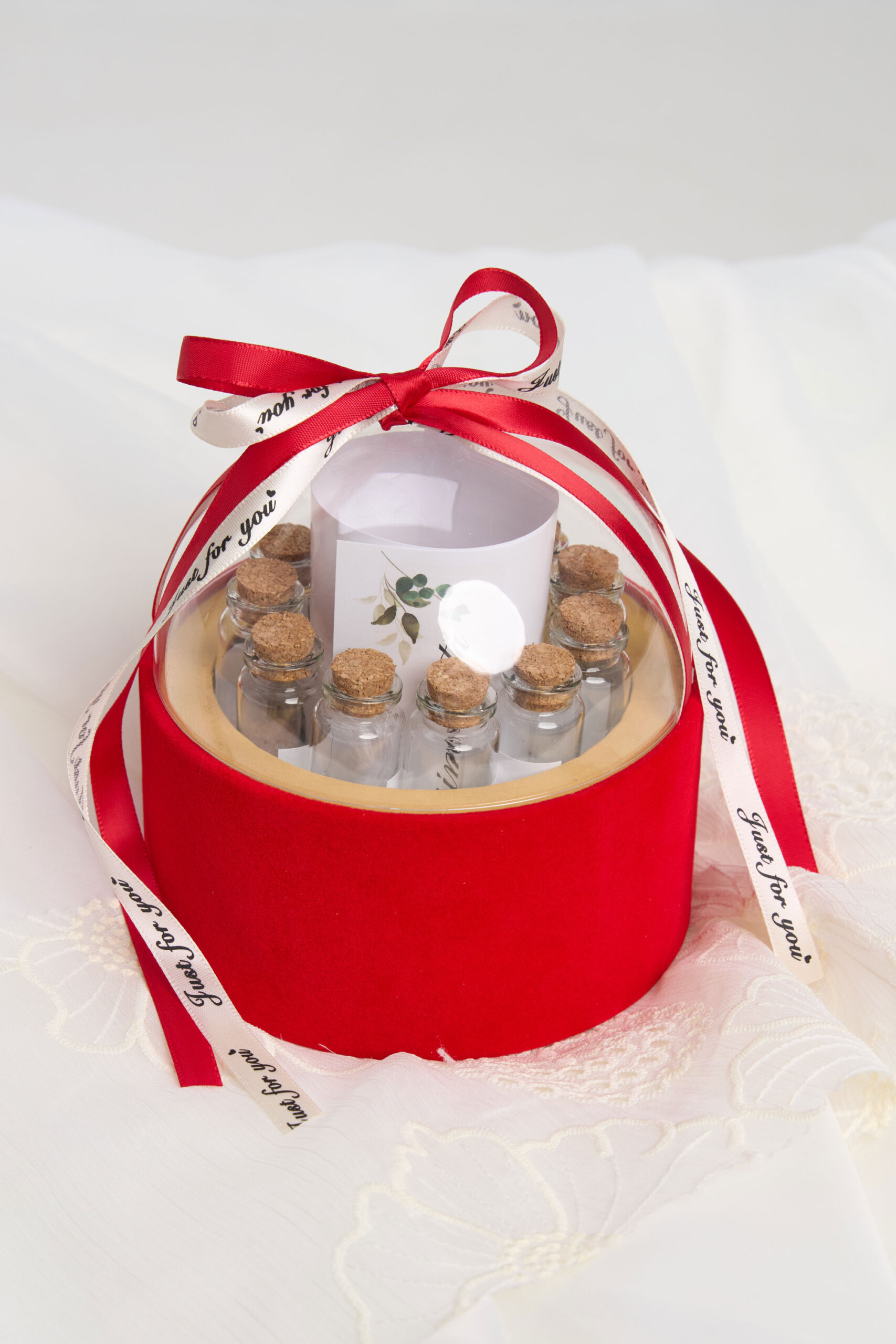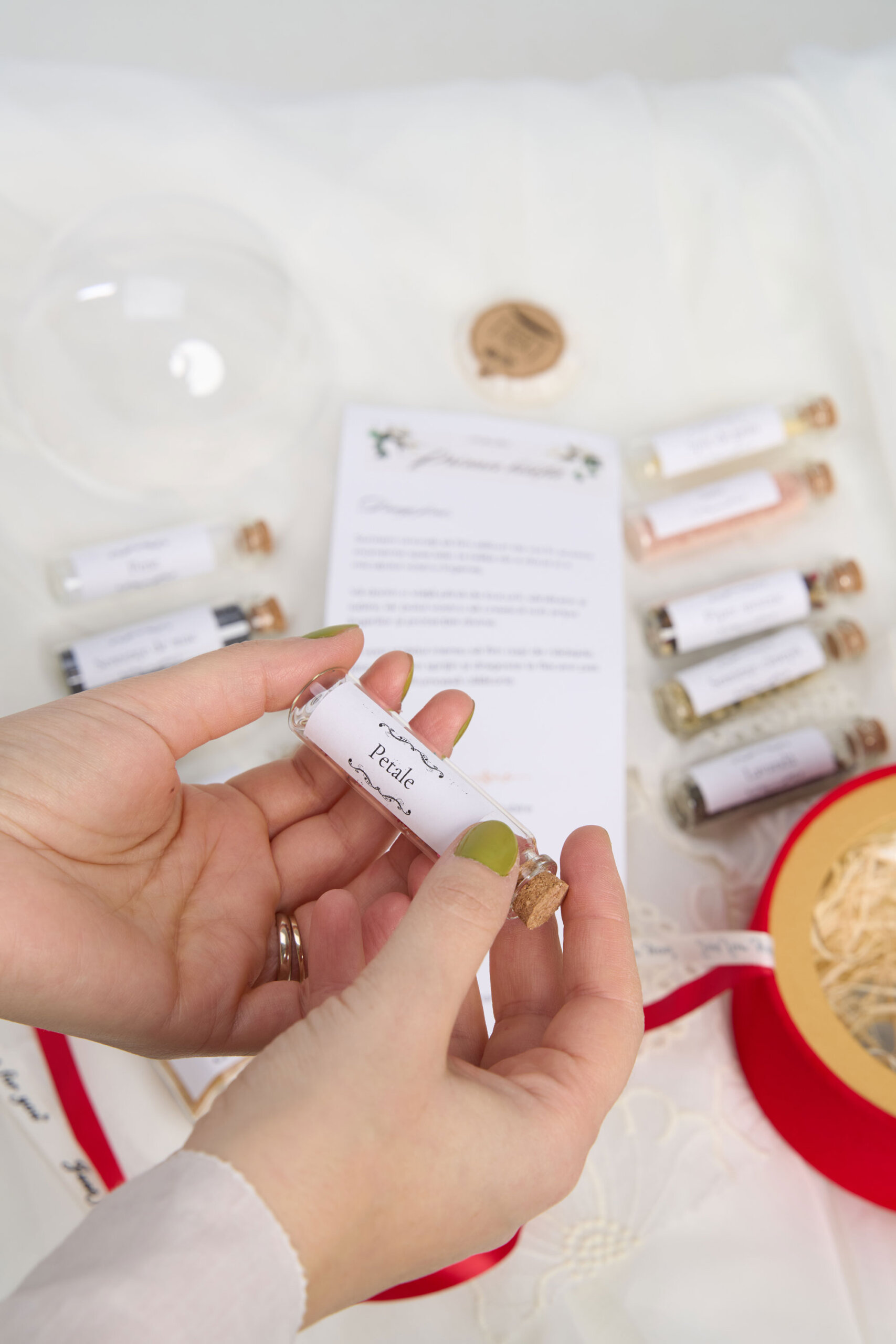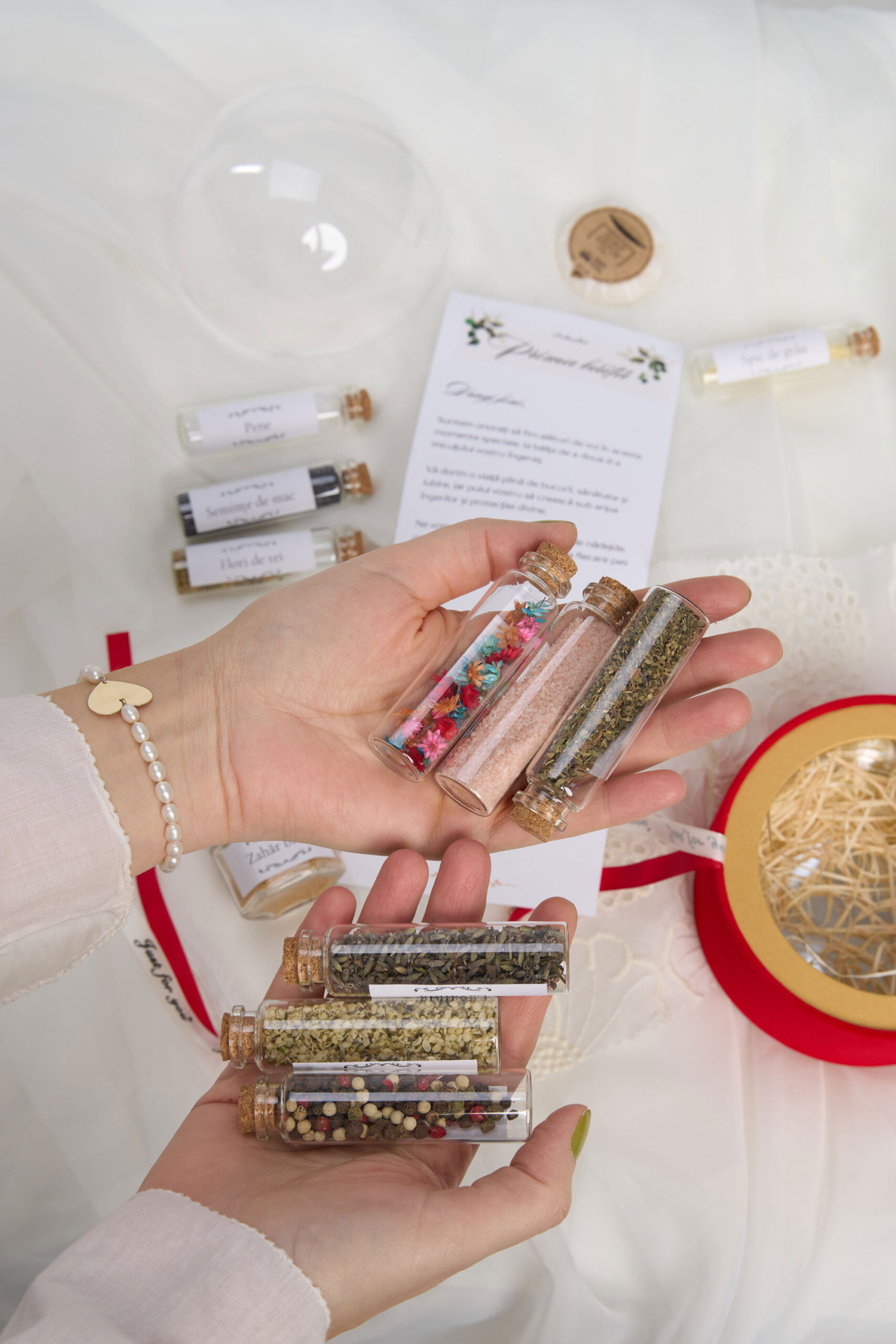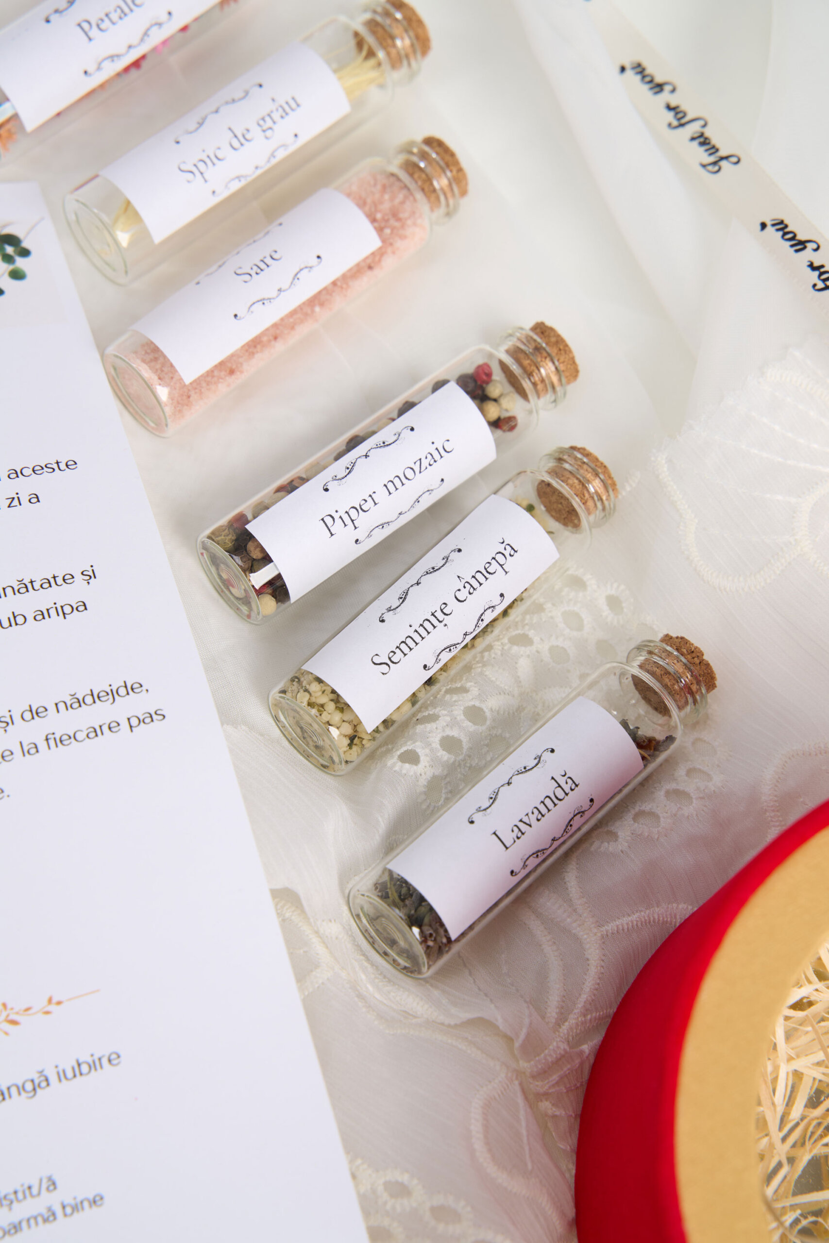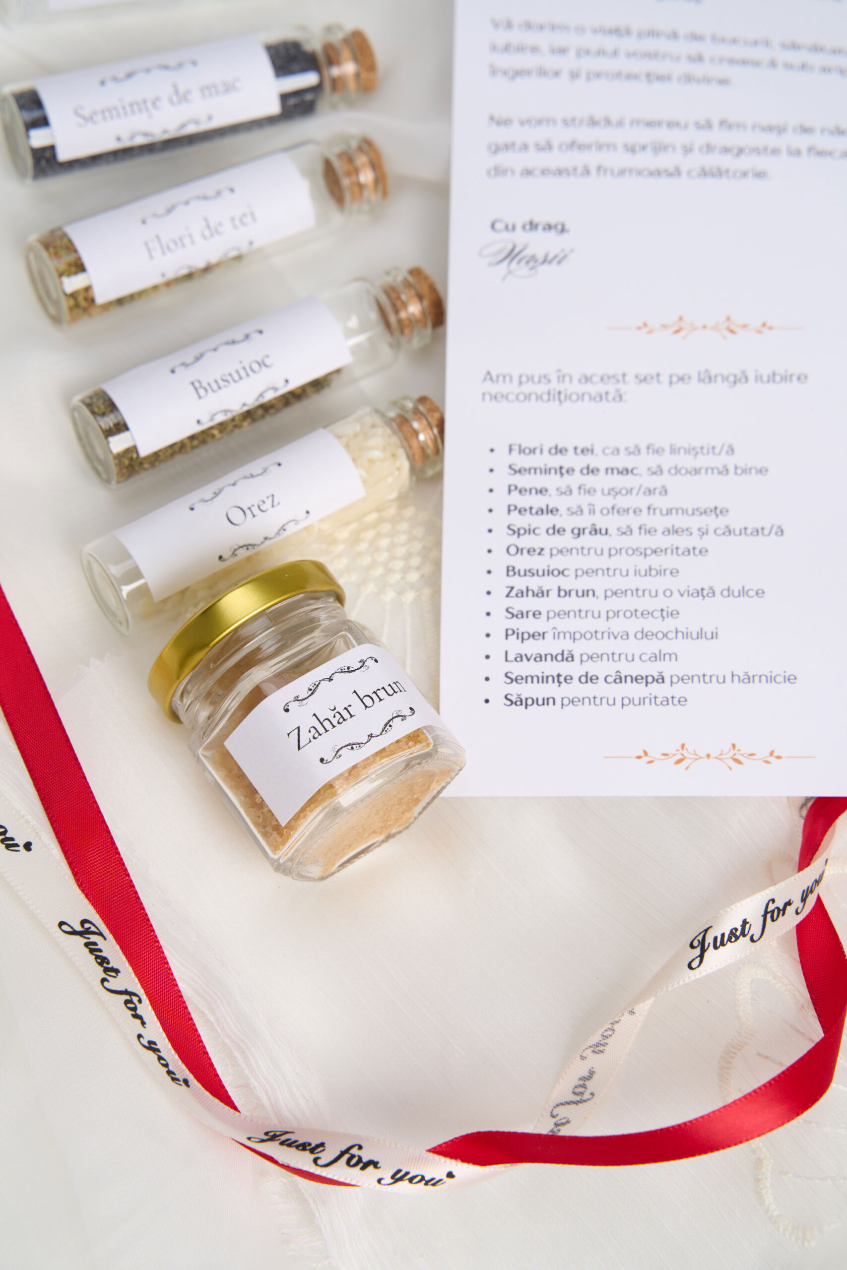 Setul vine într-o cutie rafinată, cu capac transparent, decorată cu o panglică fină și panglică roșie de satin, ideală pentru a fi oferită în dar cu ocazia primei băițe. Fiecare ingredient este ambalat în recipiente individuale, păstrând astfel esența și prospețimea fiecăruia.