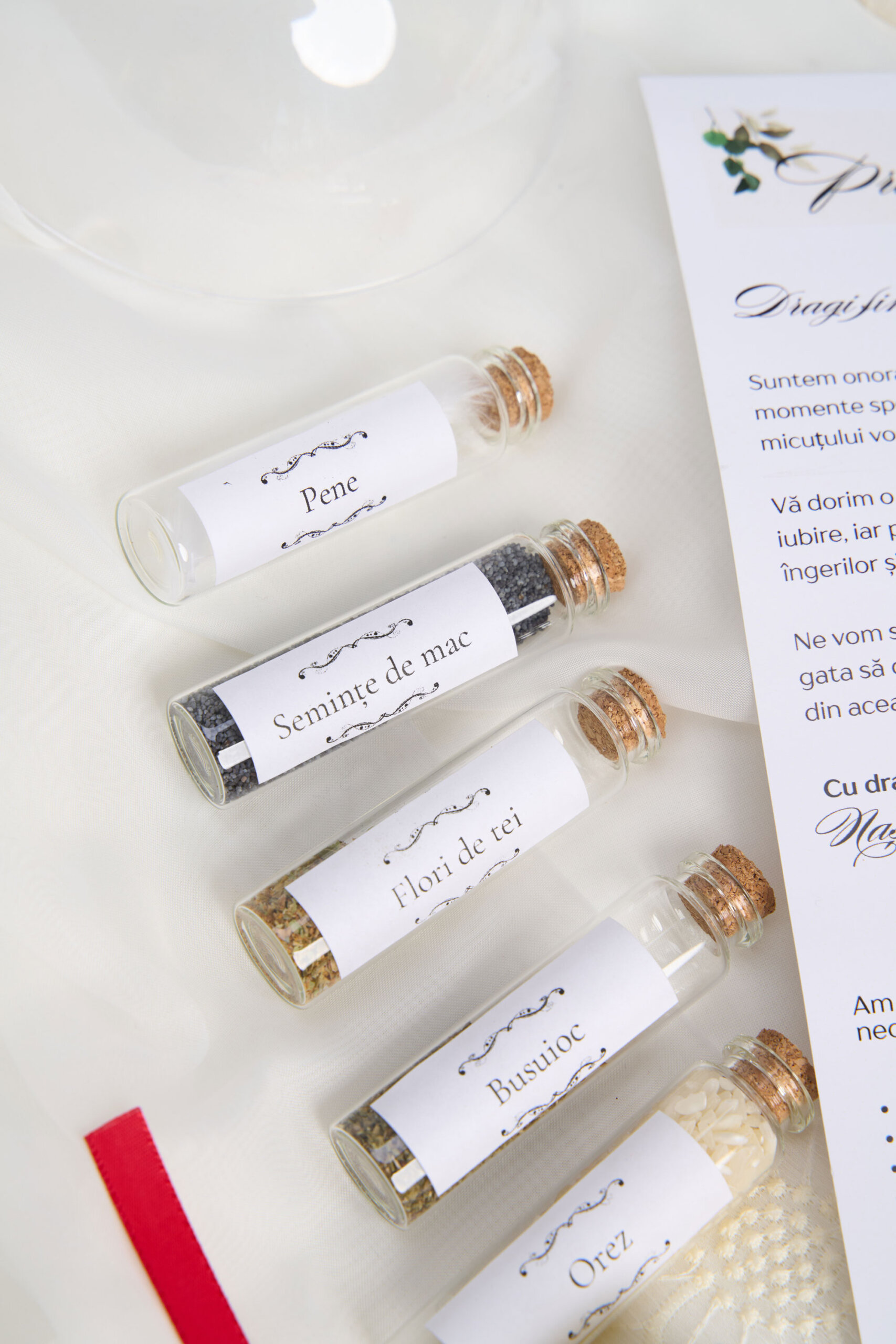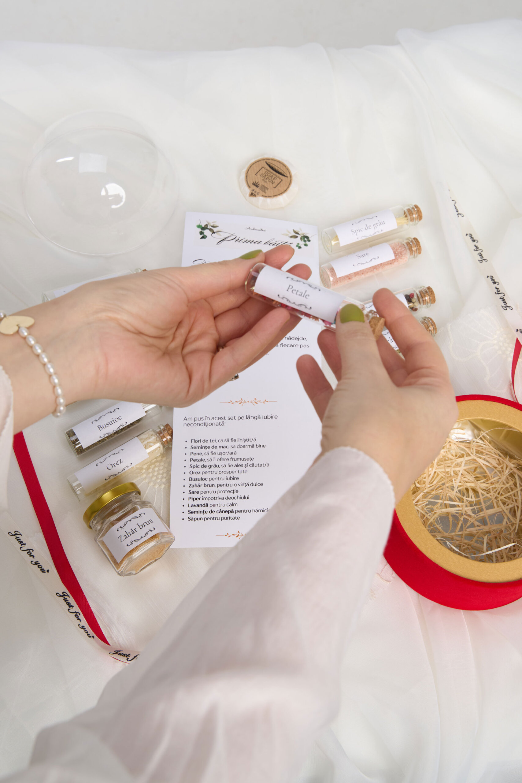 Acest set special pentru “prima băiță” este creat pentru a marca un moment unic și plin de emoție în viața micuțului tău, alături de familie și nași. Setul include o colecție atent selectată de ingrediente naturale și simbolice, fiecare cu o semnificație aparte, inspirată din tradiții străvechi, menite să aducă sănătate, protecție și prosperitate copilului.