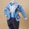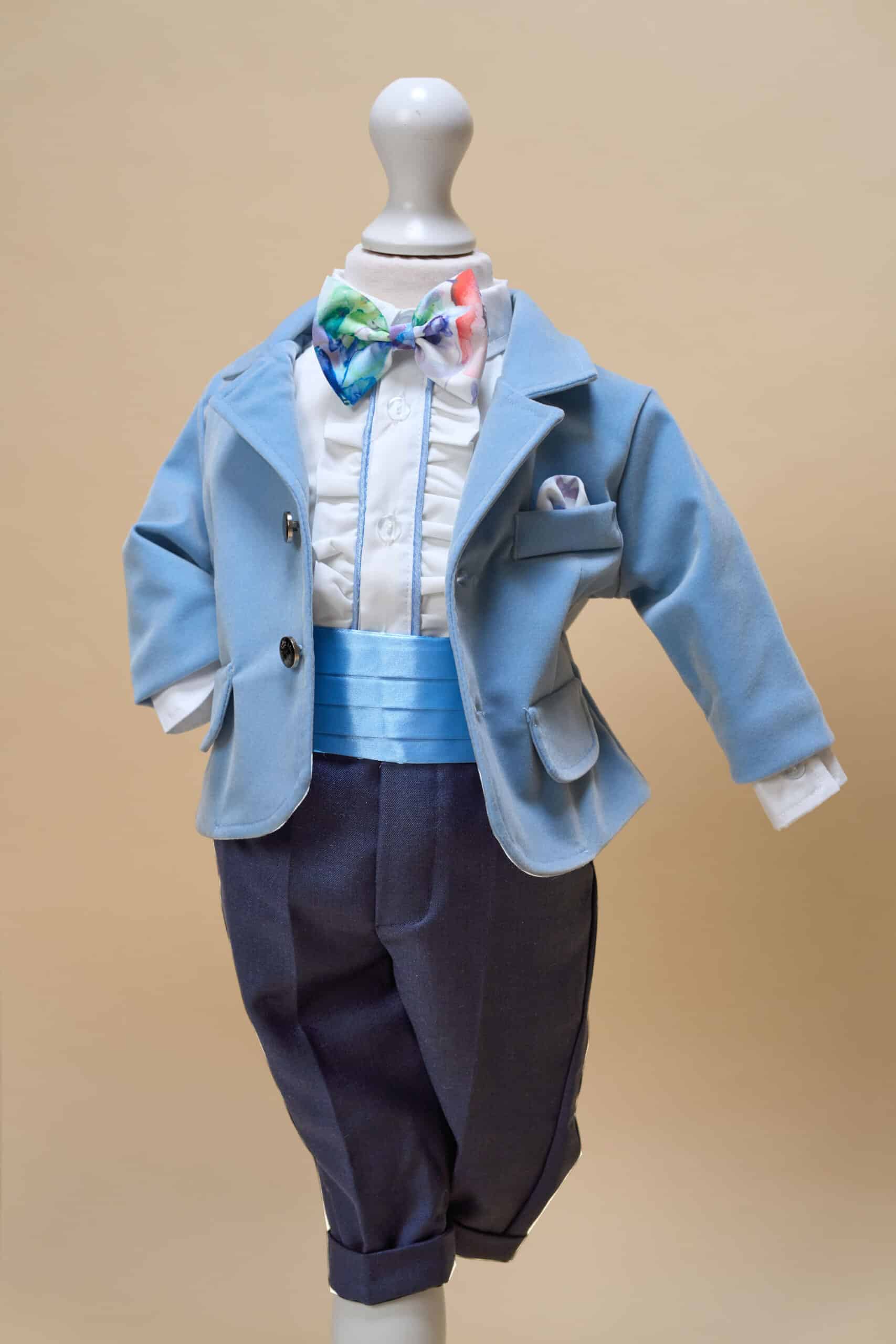 ✂︎ Costum botez băieți – Elegant, cu sacou catifea, brâu din satin, detașabil, pantaloni stofă și cămașă cu detaliu fentă cu jabou scurt.