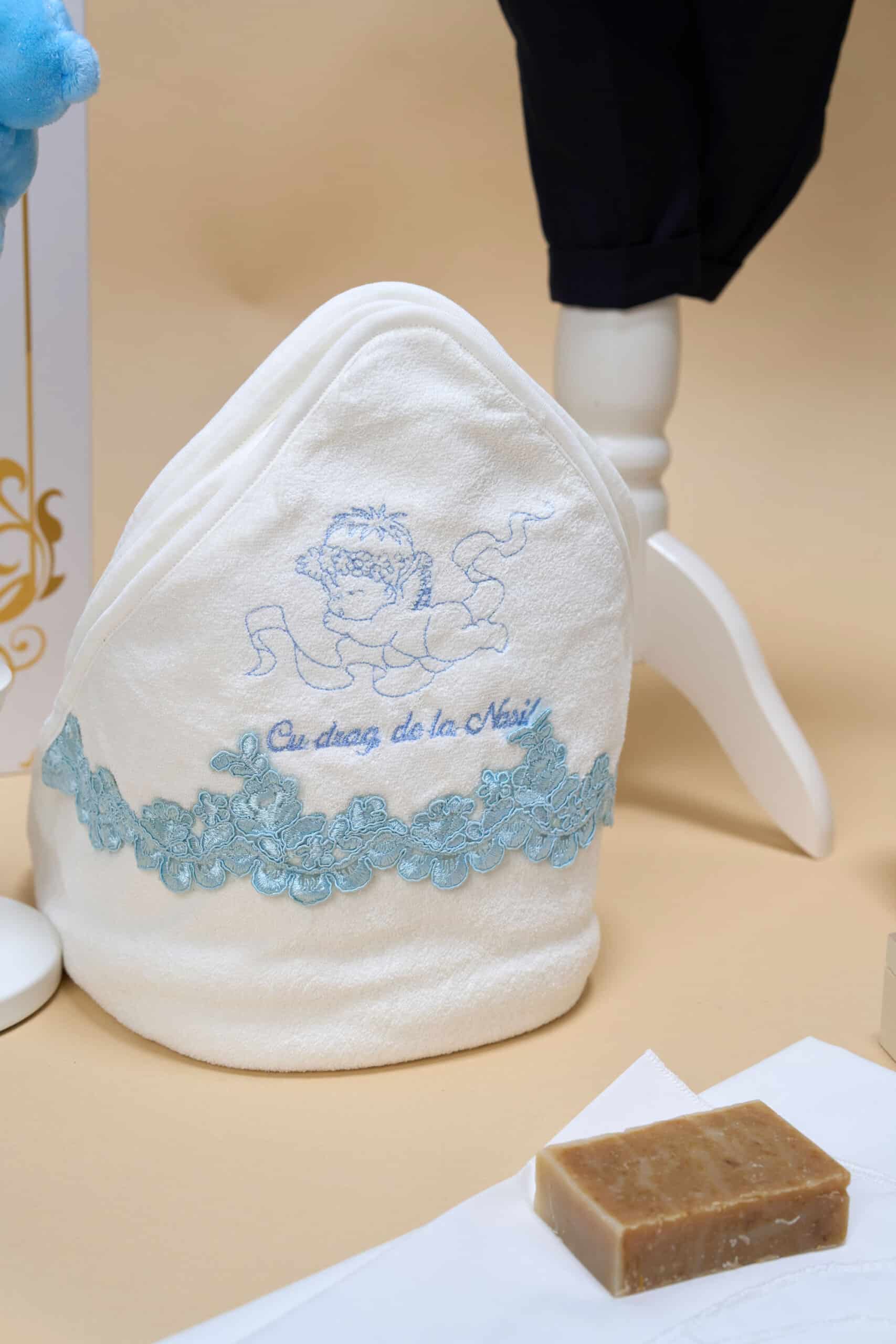 🕊️ Trusou de botez 9 piese – Tot ce ai nevoie într-un singur loc! Prosop cu capișon bebeluș, scutec bumbac cu capișon bebeluș, prosop preot, pânză de mir, fașă, săpun, sticluță mir decorată, cutiuță pentru prima șuviță și mini ramă “mărturie” – pentru poză bebeluș sau iconiță.