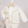 ✂︎ Costum botez băieți – Elegant, cu sacou catifea, brâu din satin, detașabil, pantaloni stofă și cămașă cu detaliu fentă cu jabou scurt.
