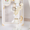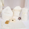 🕊️ Trusou de botez 9 piese – Tot ce ai nevoie într-un singur loc! Prosop cu capișon bebeluș, scutec bumbac cu capișon bebeluș, prosop preot, pânză de mir, fașă, săpun, sticluță mir decorată, cutiuță pentru prima șuviță și mini ramă “mărturie” – pentru poză bebeluș sau iconiță.