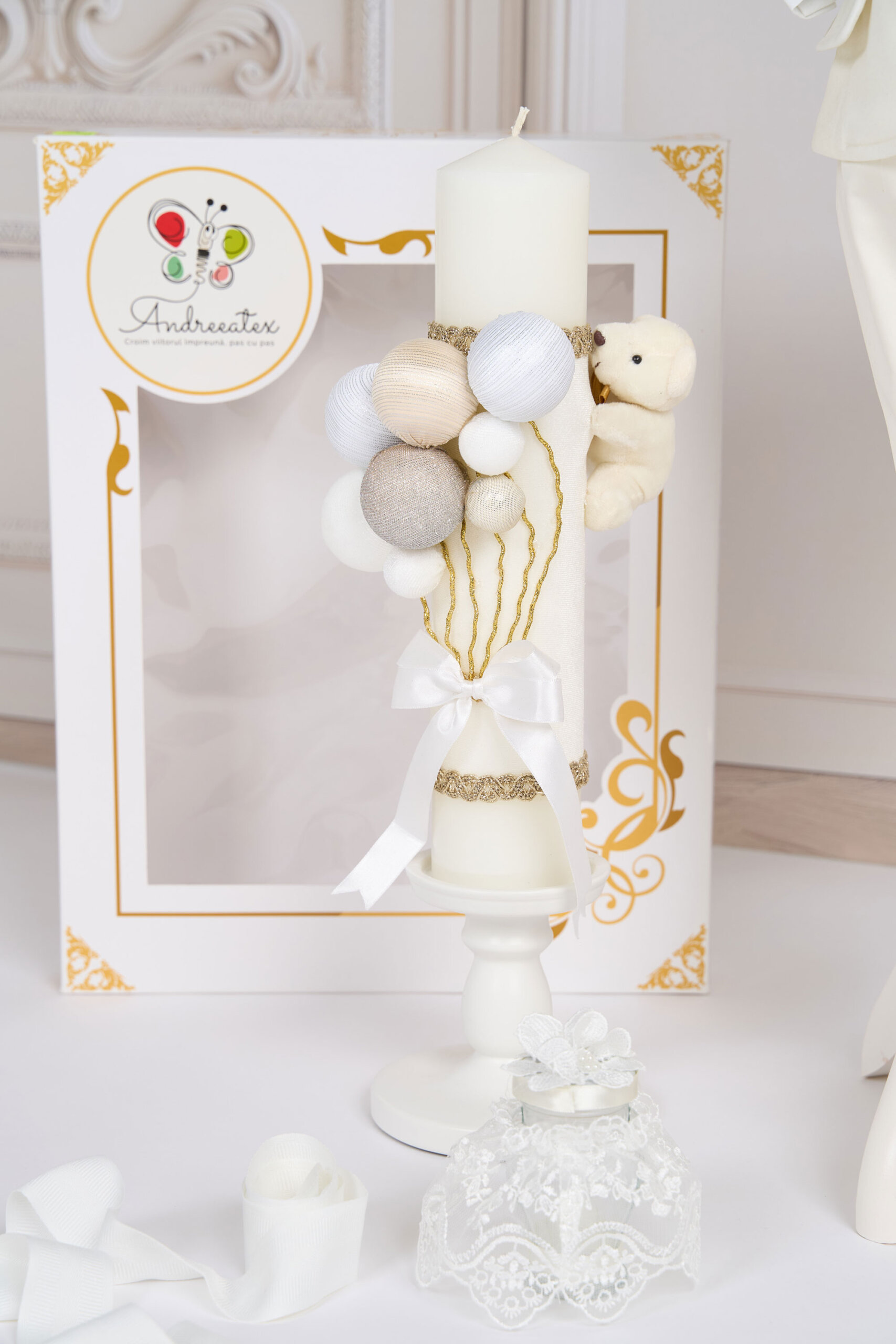 🕯️ Lumânare de botez – Lumânare cu baloane din catifea în nuanțe delicate de crem, alb și auriu, accesorizată cu ursuleț de pluș