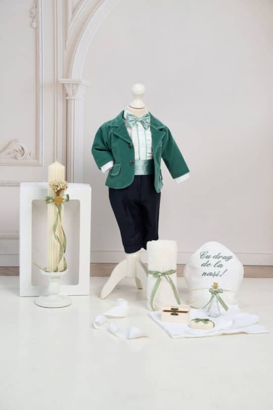 – Costumul de botez conține 5 piese: pantaloni (stofă), brâu (satin), sacou (catifea), cămașă (bumbac), papion.