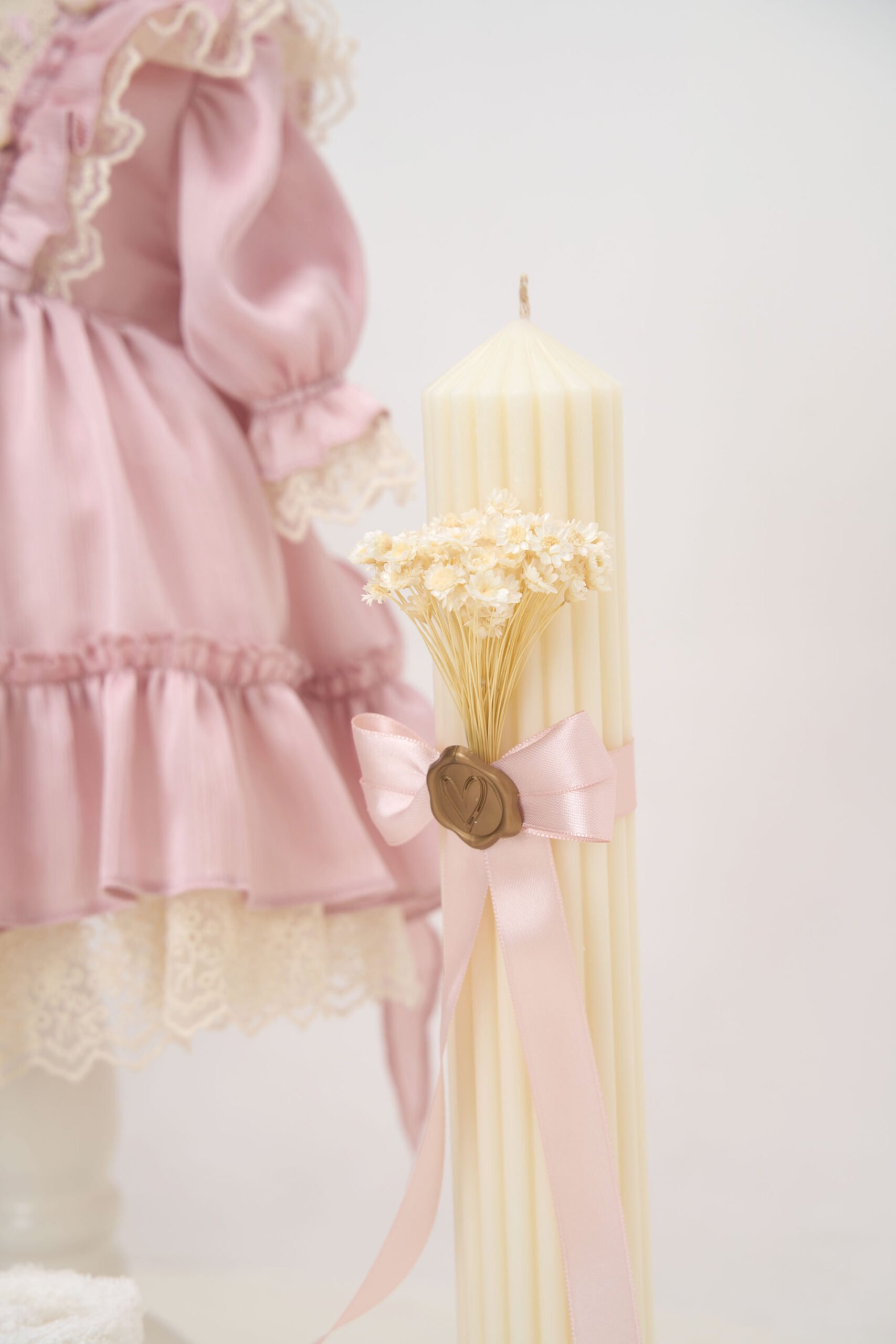 Lumânare de botez – Lumânarea de botez este decorată cu floricele uscate, fundă din satin roz și sigiliu elegant auriu, pentru un stil delicat, modern și natural.