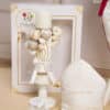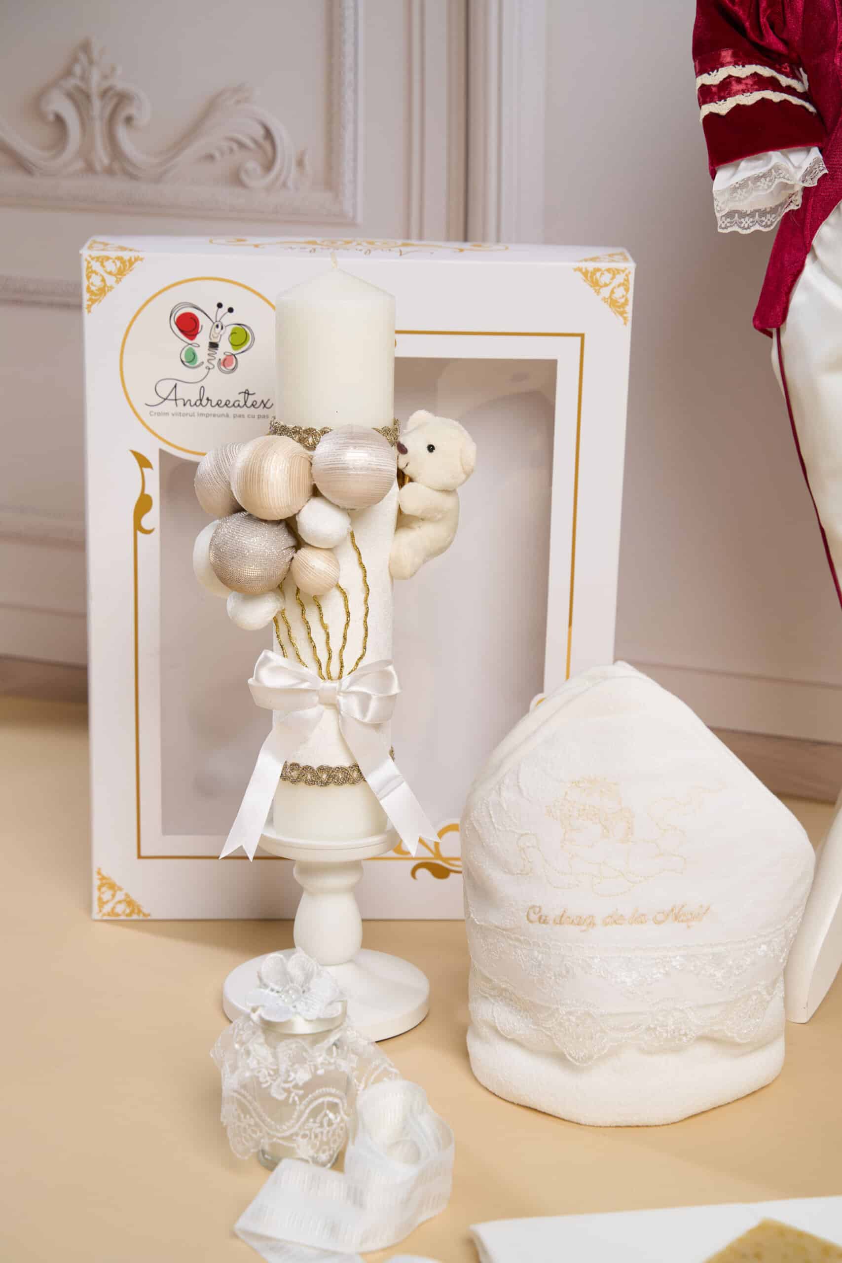 🕯️ Lumânare de botez – Lumânarea are un design unic, fiind decorată cu un ursuleț adorabil, alături de detalii elegante, precum sfere ornamentale în nuanțe de alb și auriu și o panglică albă din satin. Aceasta nu doar completează perfect setul, dar adaugă și un element jucăuș și cald ceremoniei de botez.