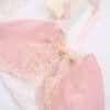 Bustul este decorat cu o dantelă brodată sofisticată, într-un model floral ce coboară armonios pe mijlocul rochiei, completat de două panglici delicate din satin, legate în fundițe.
