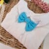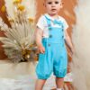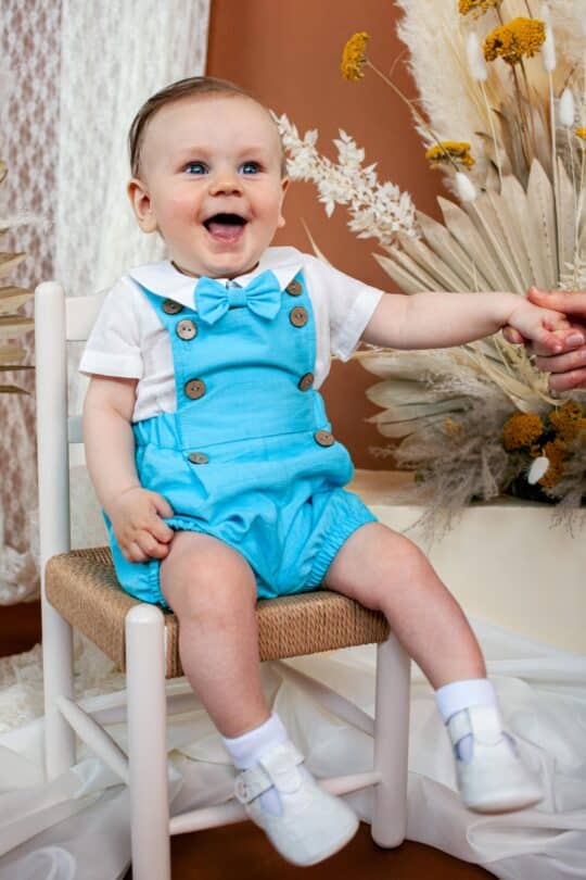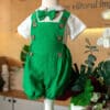 Pentru a se deschide mai ușor, salopeta are 6 nasturi distribuiți stânga dreapta, nasturi cu aspect de lemn. Papionul este din același material ca salopeta și se închide cu două capse pe cămașă.