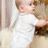 Cămașa setului este tip body din bumbac cu aspect pânză topită, cu guler rotund și nasturi plați, transparenți cu închiderepe spate.