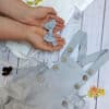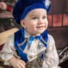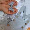 Pentru a se deschide mai ușor, salopeta are 6 nasturi distribuiți stânga dreapta, nasturi cu aspect de lemn. Papionul este din același material ca salopeta și se închide cu două capse pe cămașă.