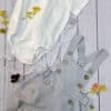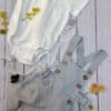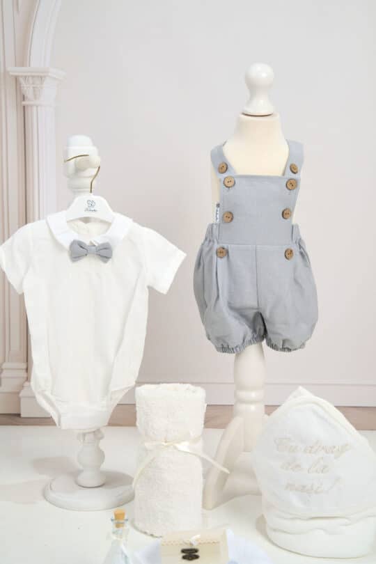 Cămașa setului este tip body din bumbac cu aspect pânză topită, cu guler rotund și nasturi plați, transparenți cu închiderepe spate.