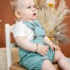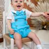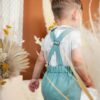 Salopetă din țesătură fină, vaporoasă cu elastic la tivul pantalonilor, cu bretele reglabile care se încrucișează la spate, reglabile cu nasturii din față.