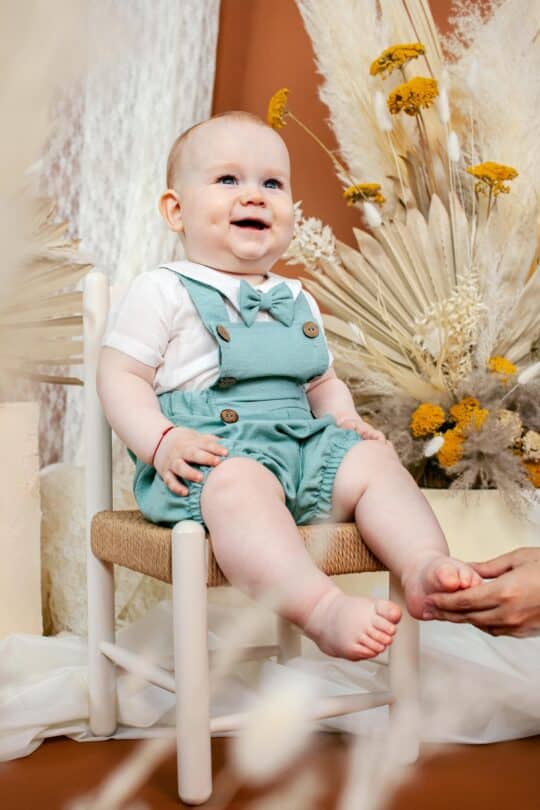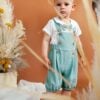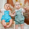 Pentru a se deschide mai ușor, salopeta are 6 nasturi distribuiți stânga dreapta, nasturi cu aspect de lemn. Papionul este din același material ca salopeta și se închide cu două capse pe cămașă.