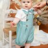 Cămașa setului este tip body din bumbac cu aspect pânză topită, cu guler rotund și nasturi plați, transparenți cu închiderepe spate.