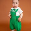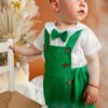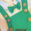 Pentru a se deschide mai ușor, salopeta are 6 nasturi distribuiți stânga dreapta, nasturi cu aspect de lemn. Papionul este din același material ca salopeta și se închide cu două capse pe cămașă.