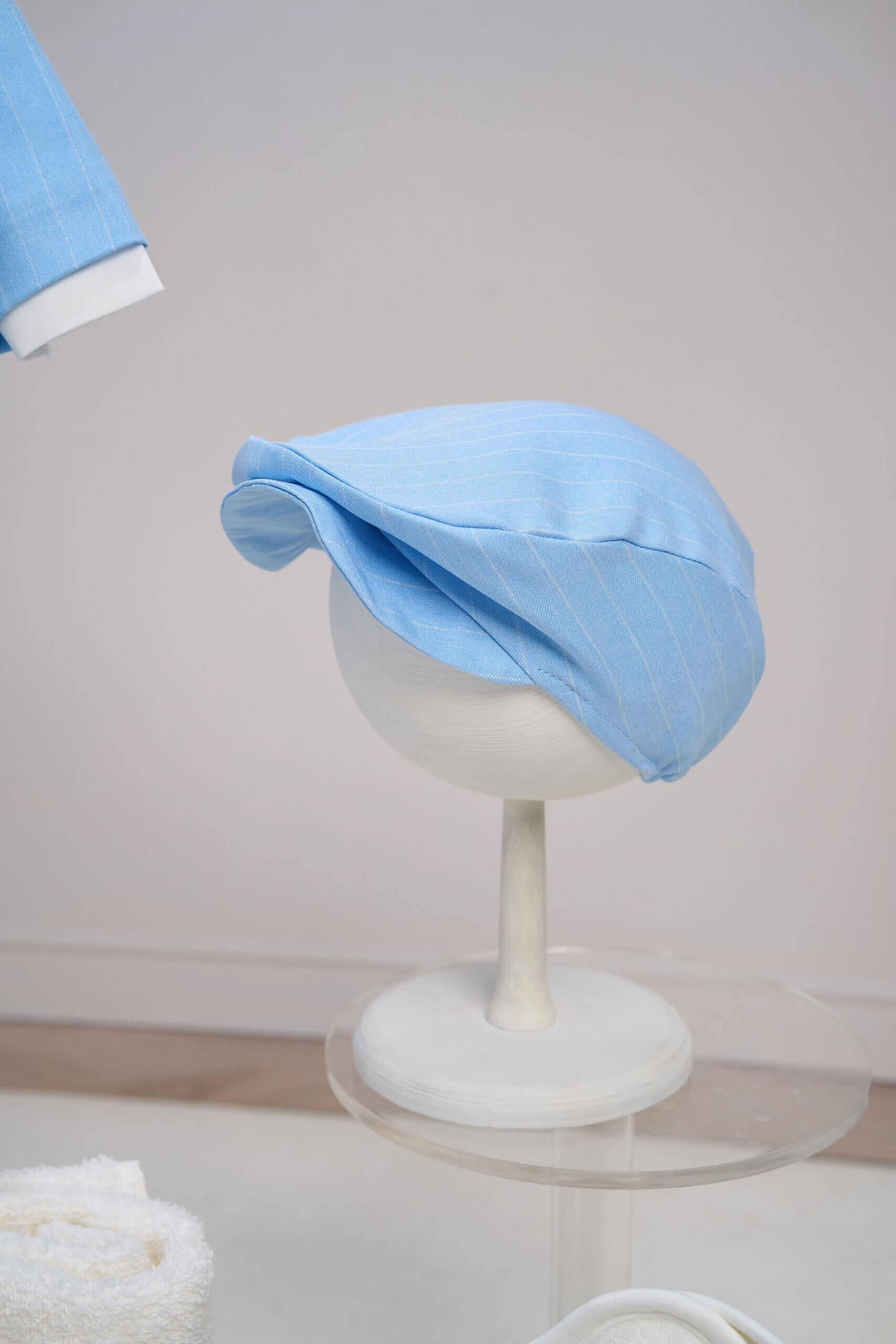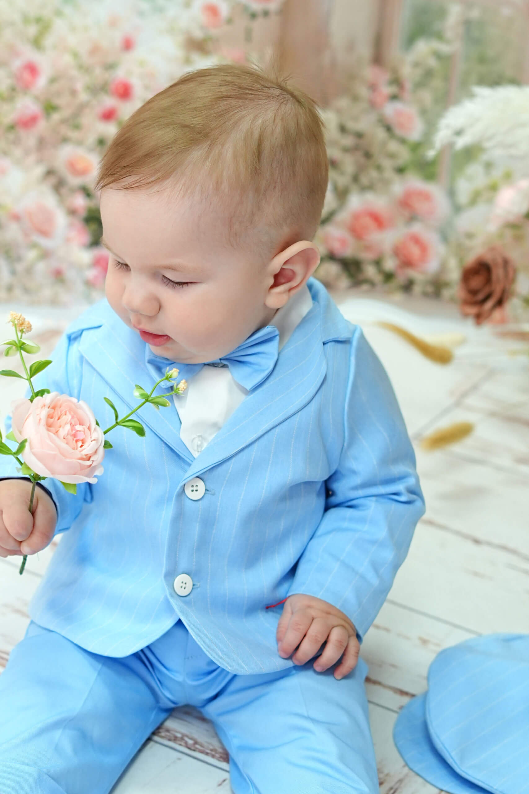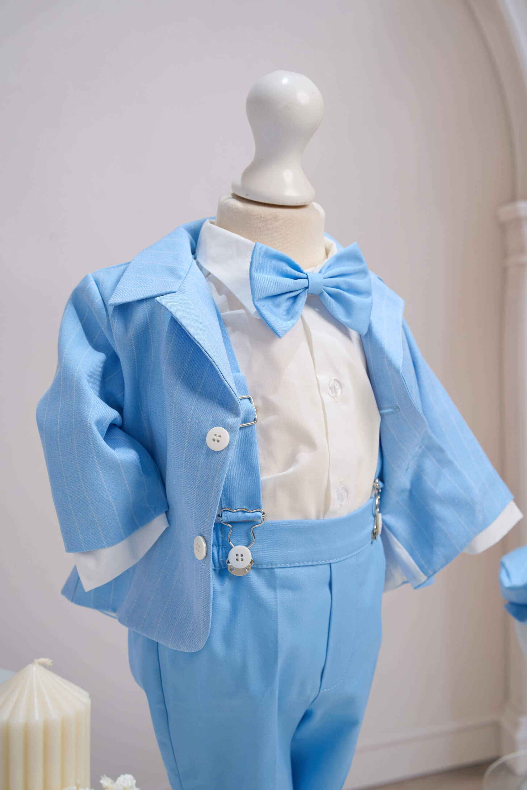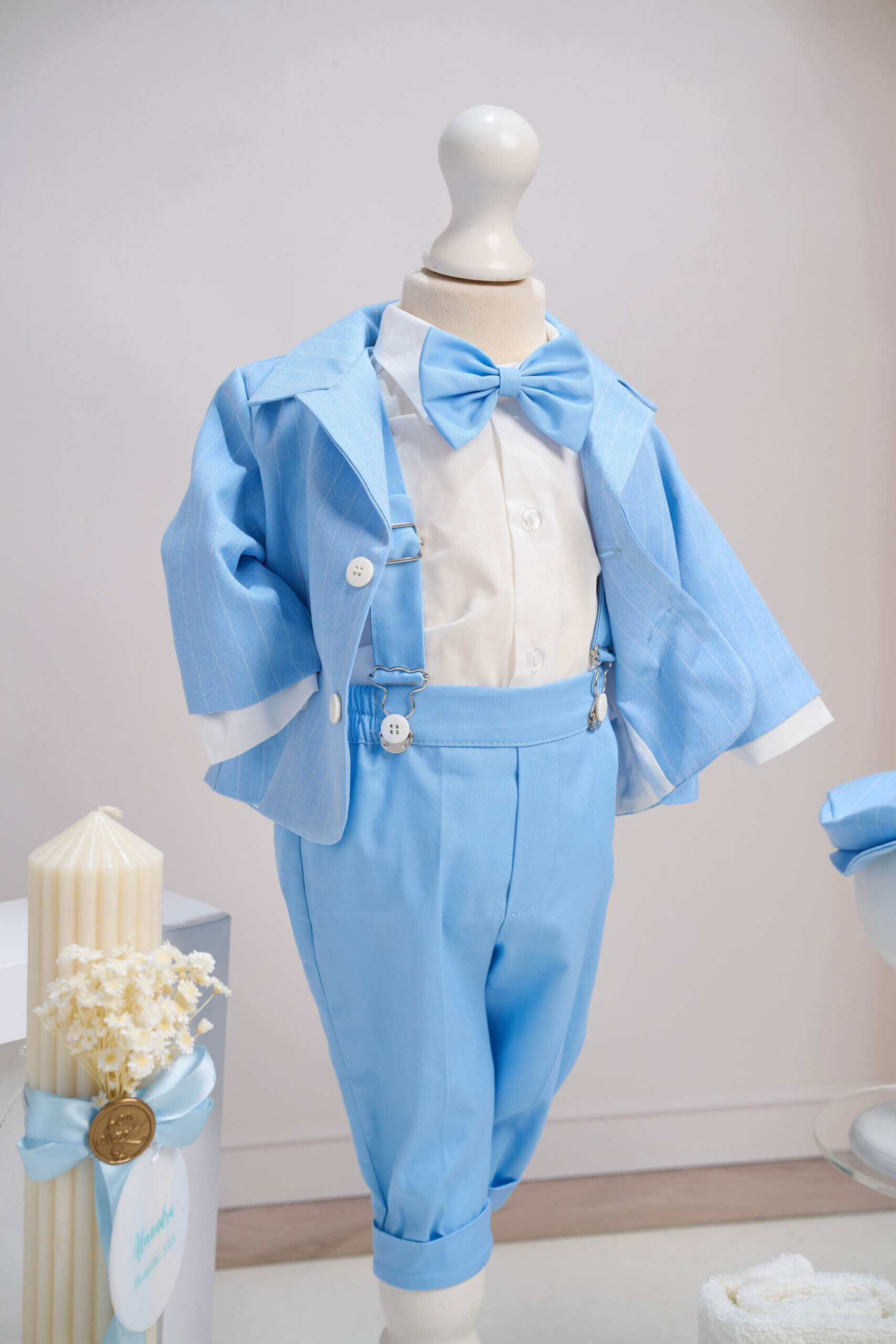 ✂︎ Costum botez băieți – Sacou Bleu cu Croială Clasică, Cămașă din Bumbac, Pantaloni Eleganți, Papion și Bretele Ivoire, Șapcă Asortată