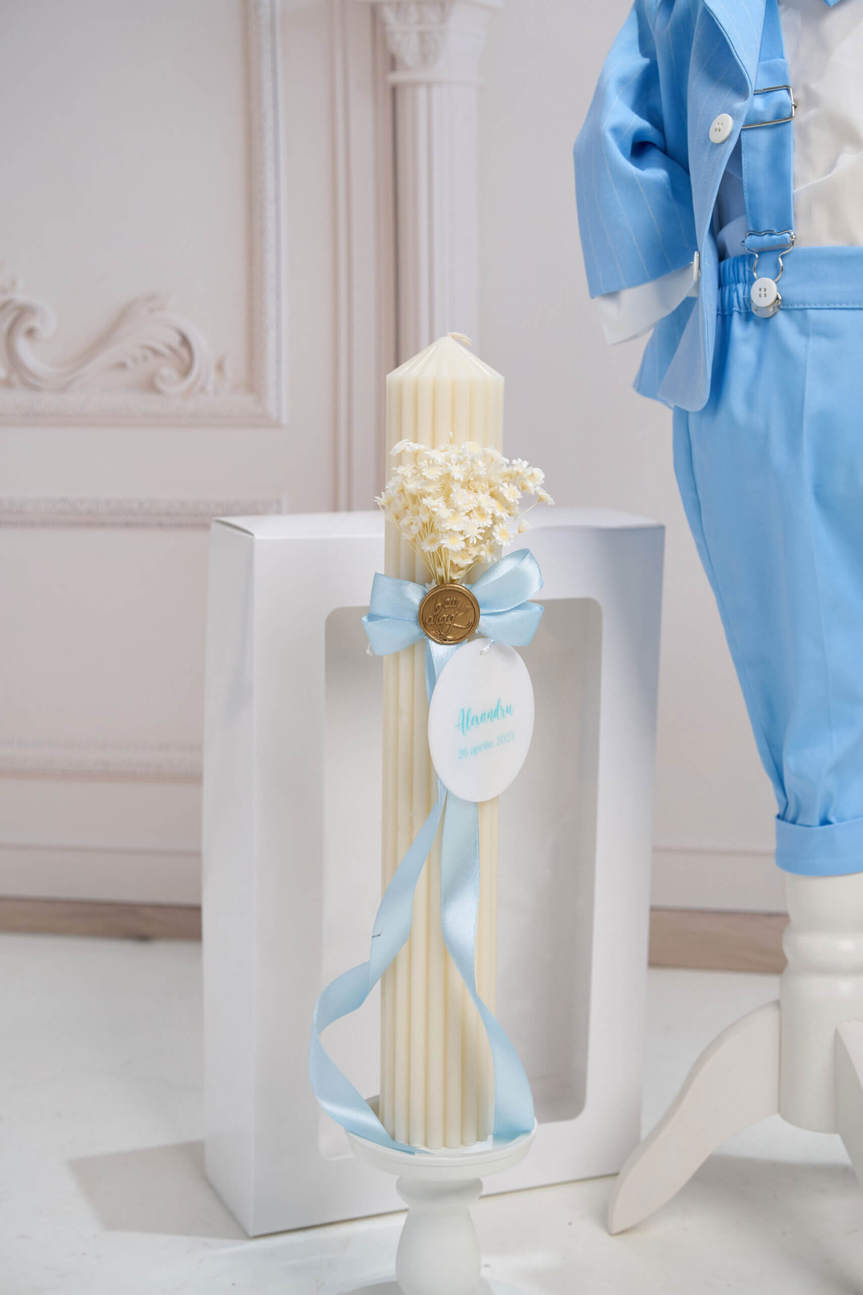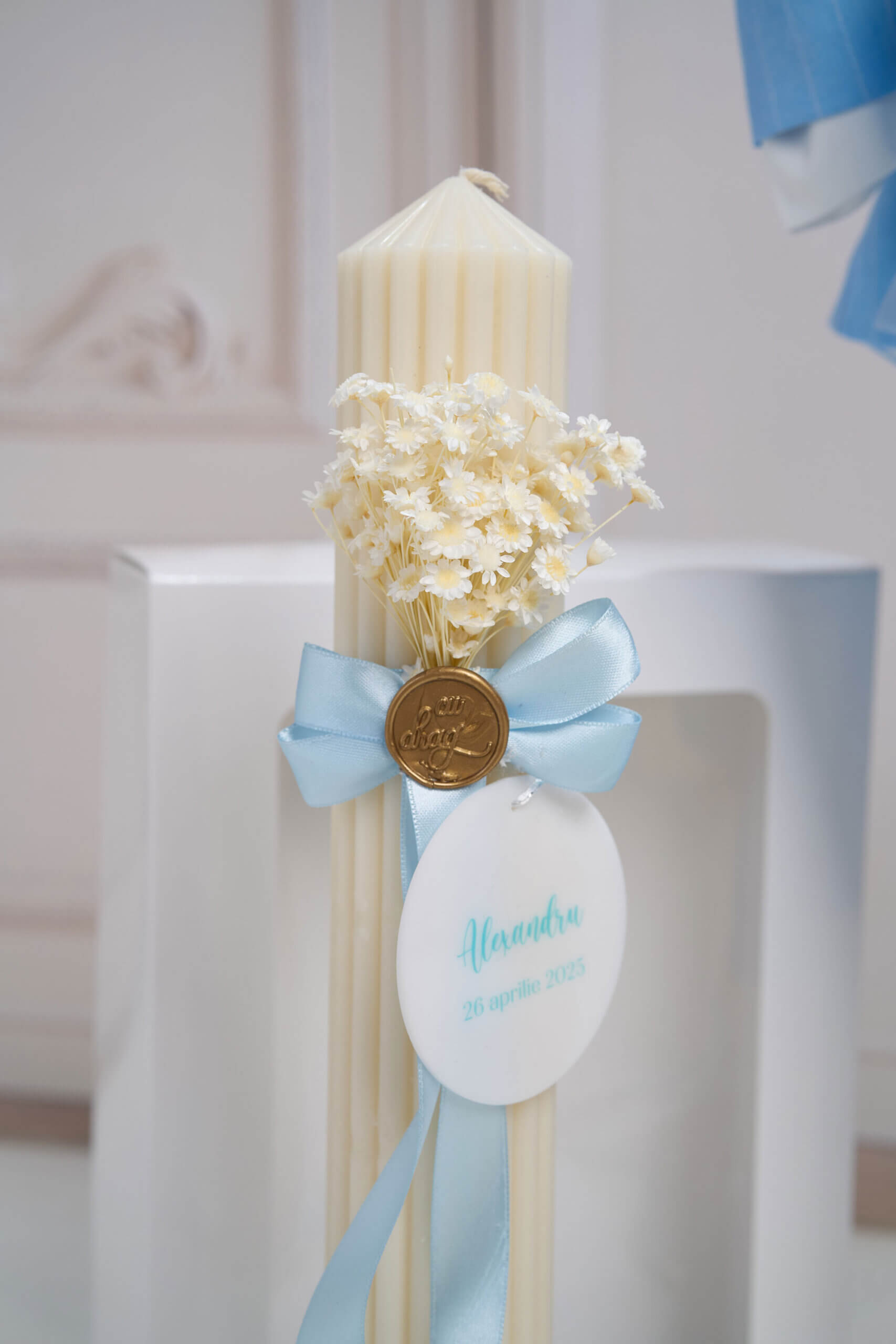 🕯️ Lumânare de botez – O lumânare de botez creată cu grijă și gânduri bune, decorată cu flori uscate și legată cu o panglică fină, pecetluită cu Sigiliul Dragostei.