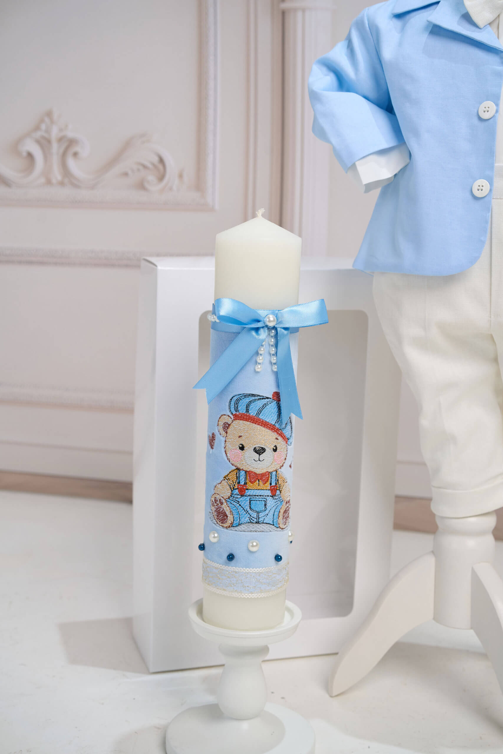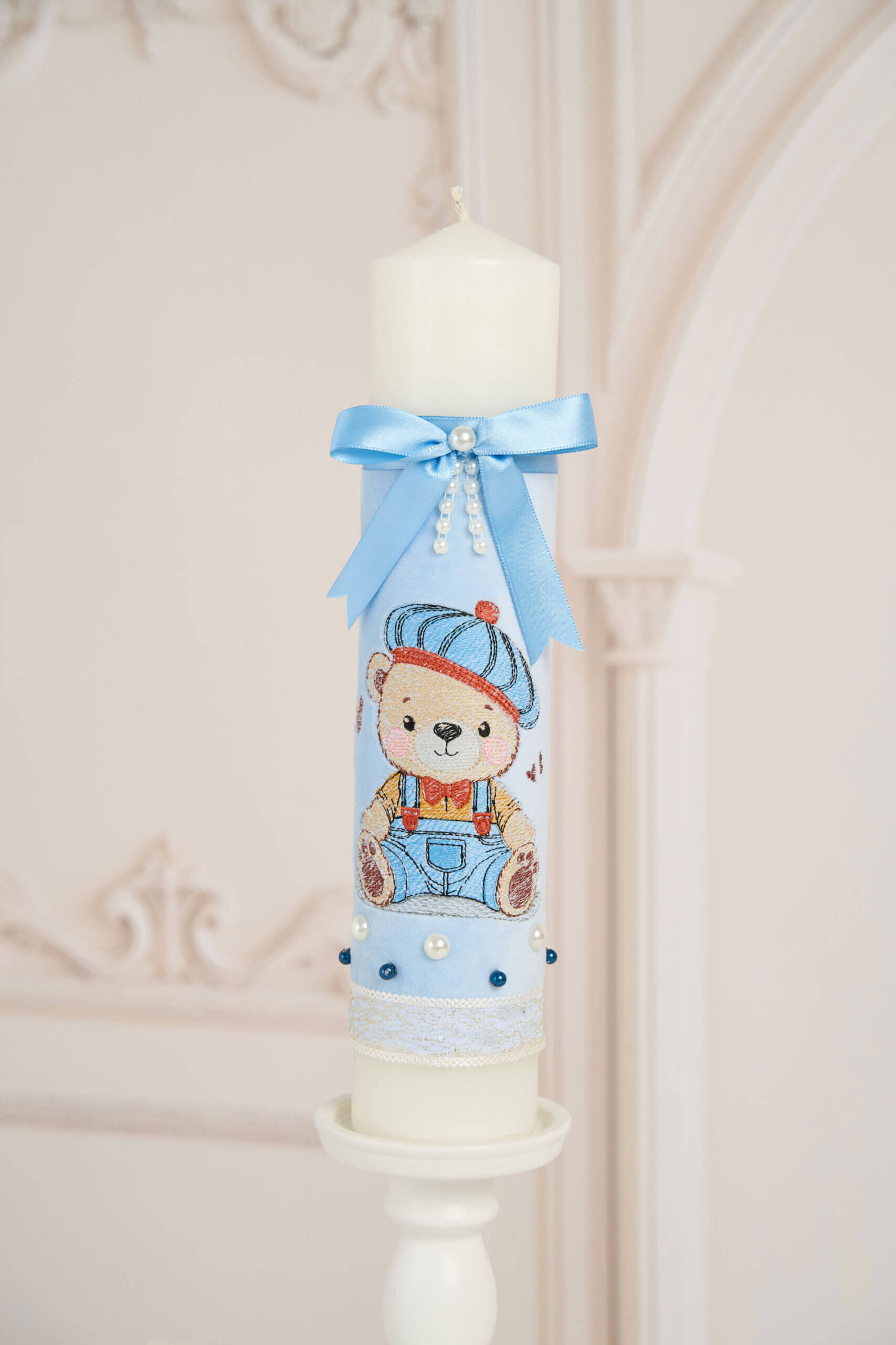 🕯️ Lumânare de botez –Decor Catifea , Ursuleț Brodat Bleu, Perluțe Aplicate Manual, Dantelă Decorativă și Fundă Satinată cu Șirag de Perle
