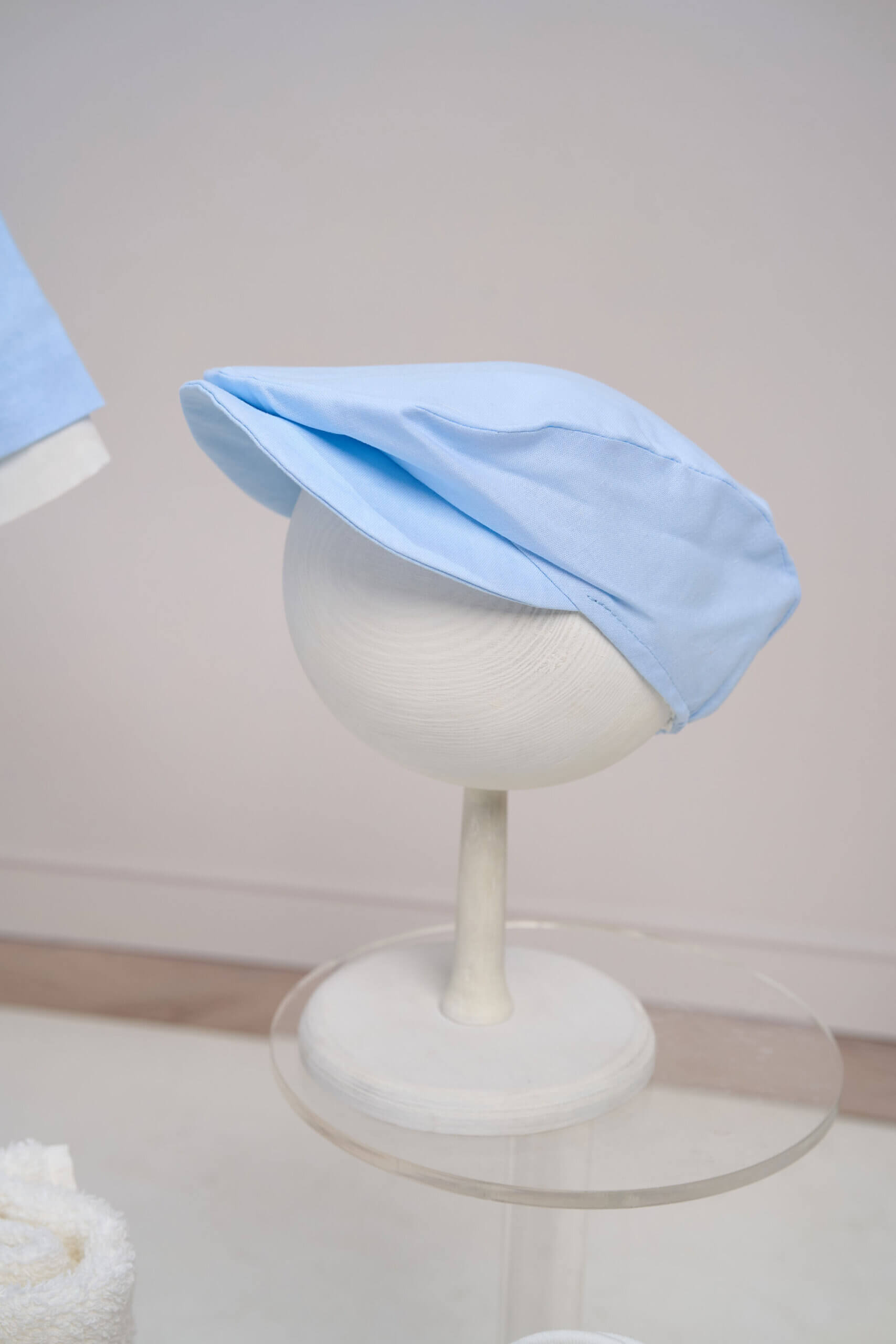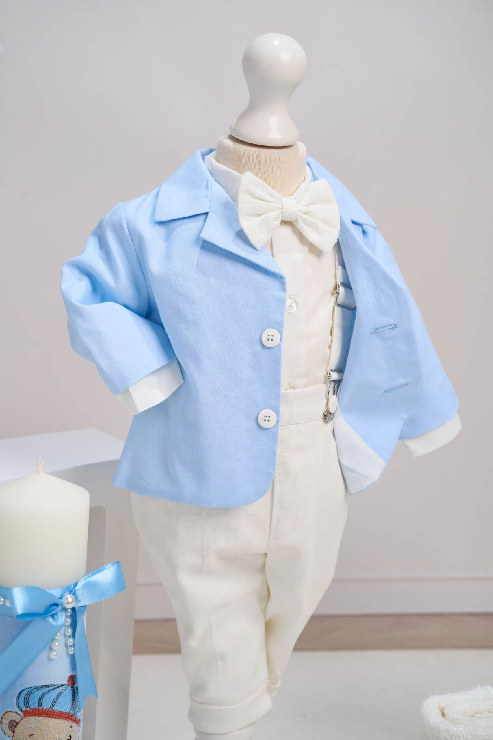 ✂︎ Costum botez băieți – Sacou Bleu cu Croială Clasică, Cămașă din Bumbac, Pantaloni Eleganți, Papion și Bretele Ivoire, Șapcă Asortată