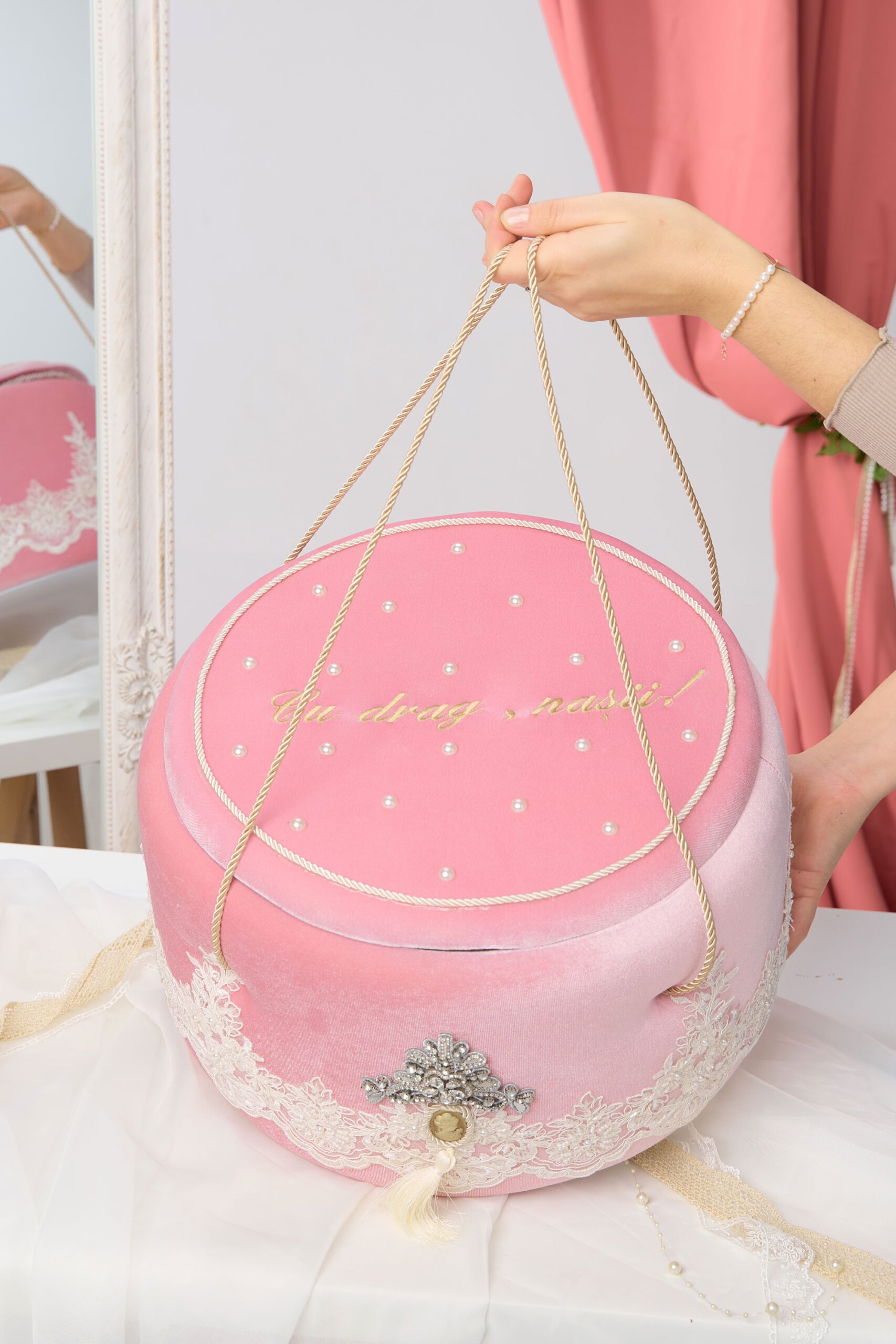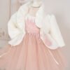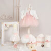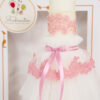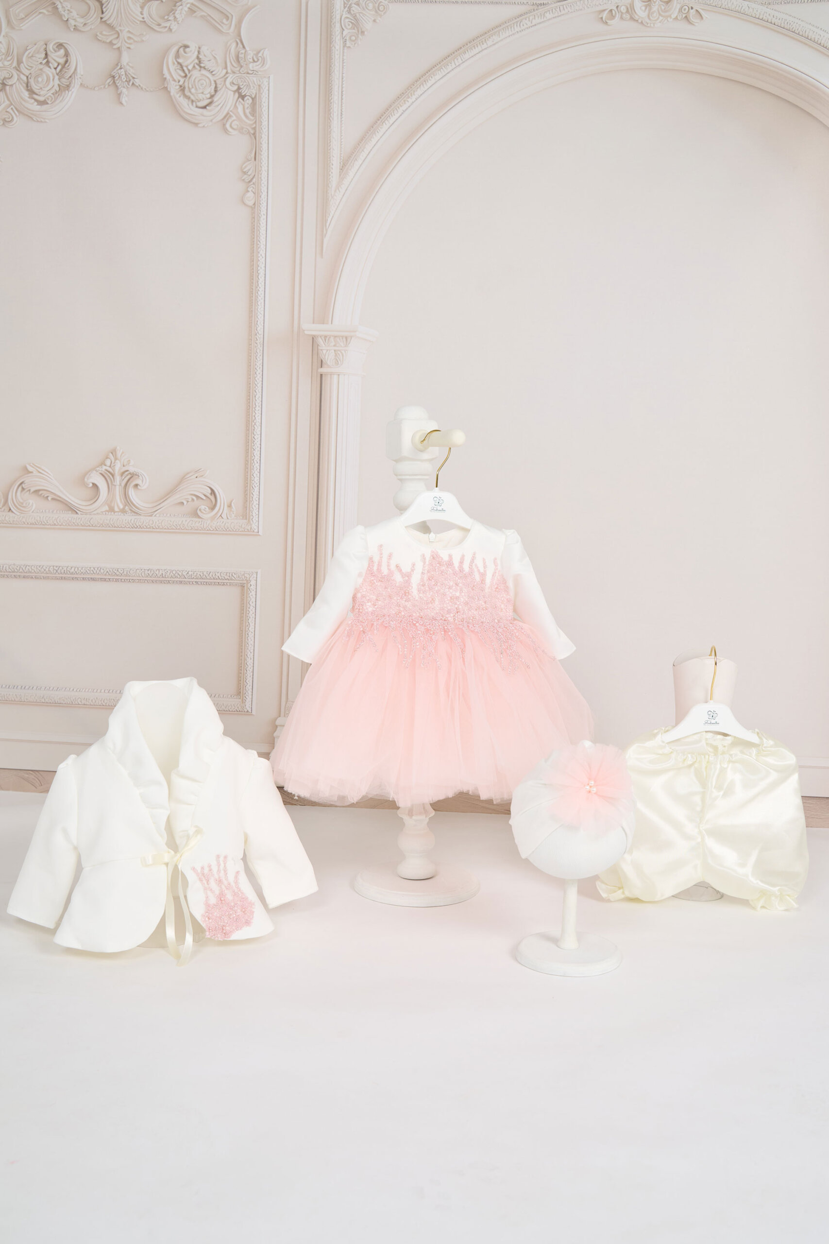 🎀 Set 4 piese – Rochie realizată din tafta ivoire delicată, cu detalii fine de dantelă pe partea superioară și o fustă din tulle vaporoasă. Jachetă cu croi simplu și elegant, completată cu o fundiță din panglică satinată și detalii aplicate din dantelă roz. Turban accesorizat cu floare din tulle roz și gogoșari din satin.