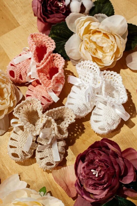 Săndăluțe pentru botez croșetate manual cu mărgeluțe.