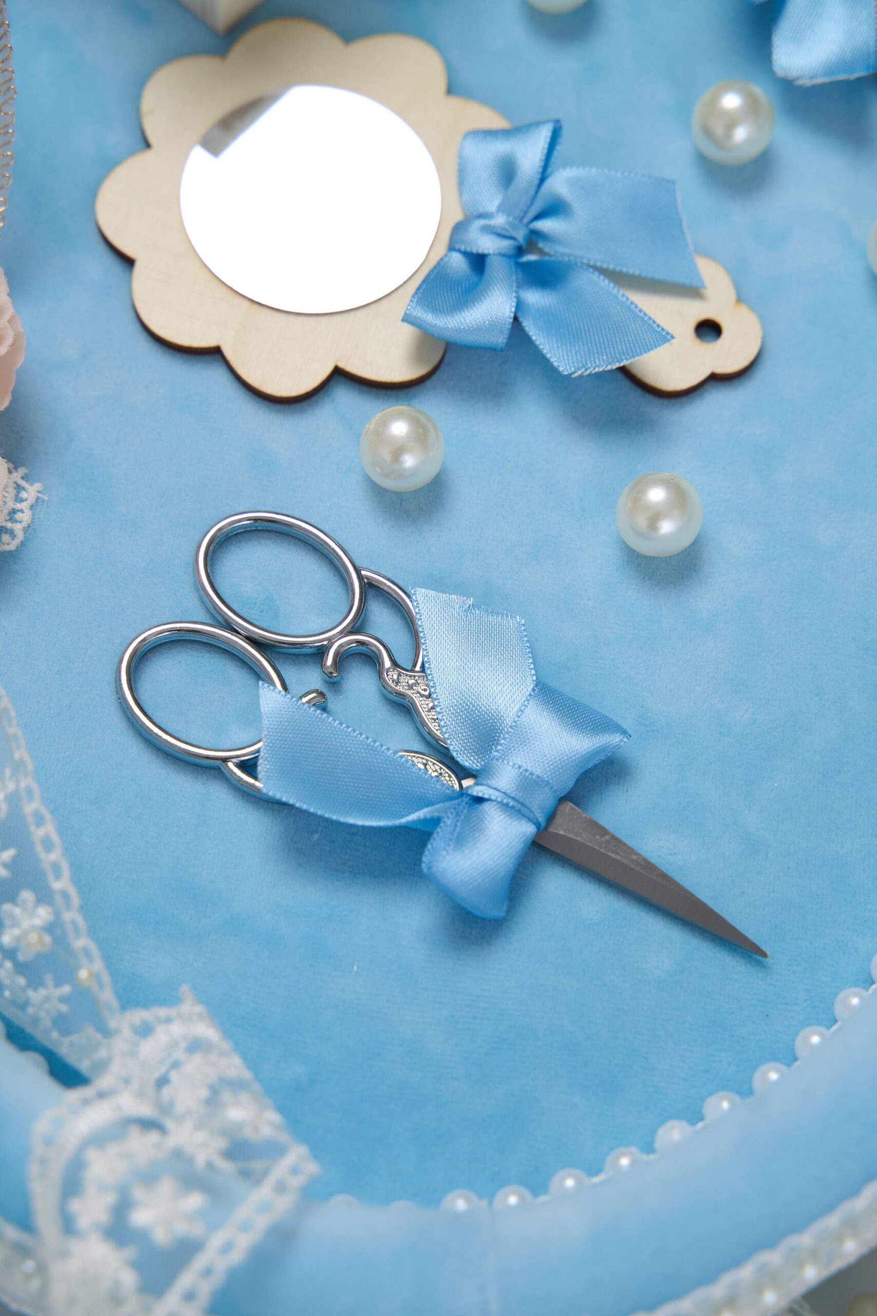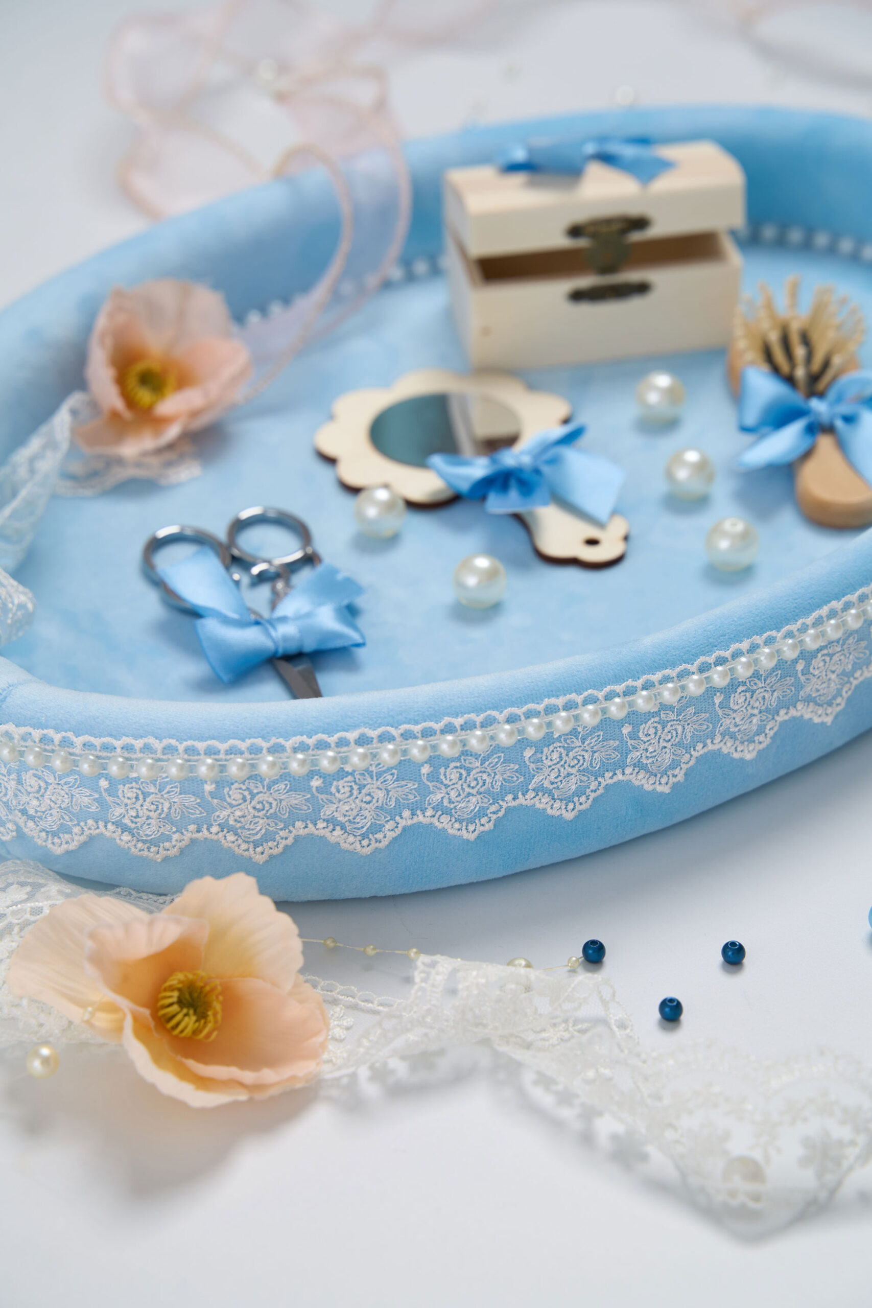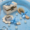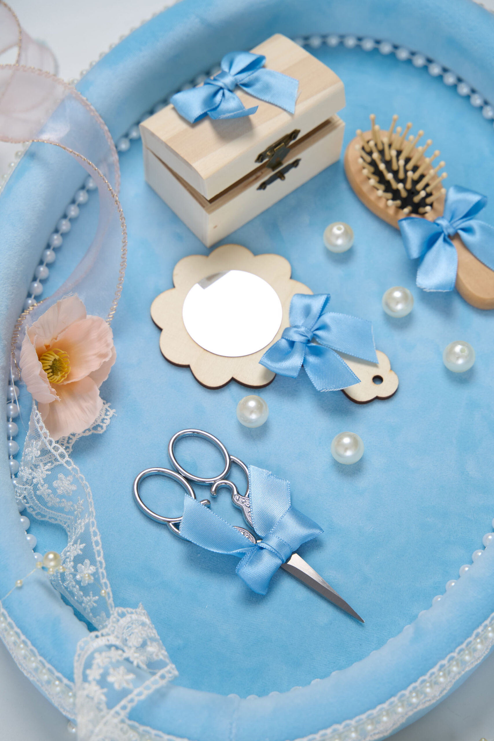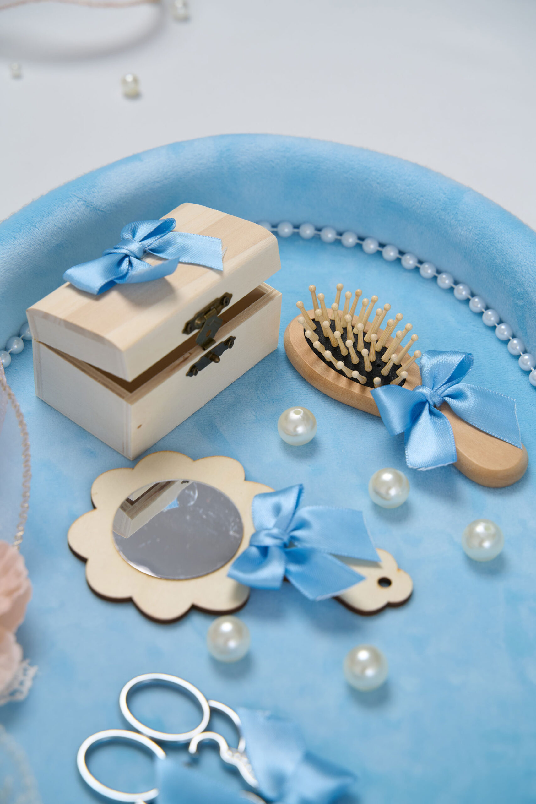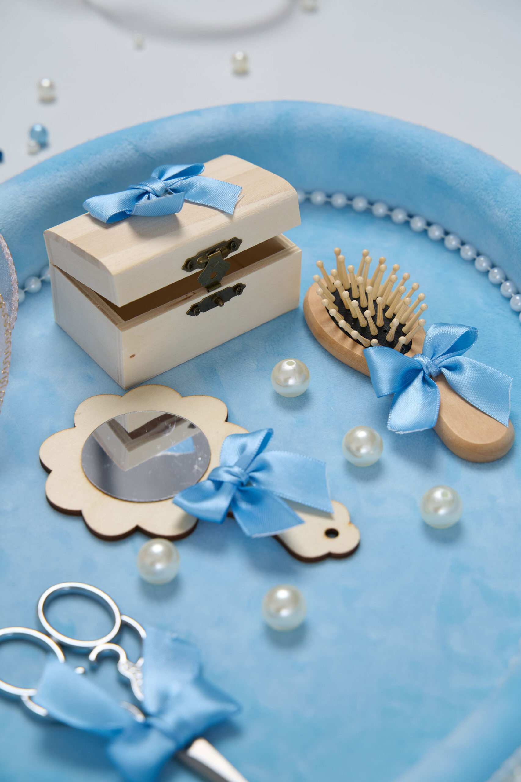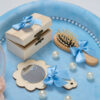 Este complet echipată cu accesorii esențiale pentru acest moment special: foarfecă, oglindă, perie și cutiuță pentru suvița de păr – toate asortate cu fundițe și detalii deosebite.