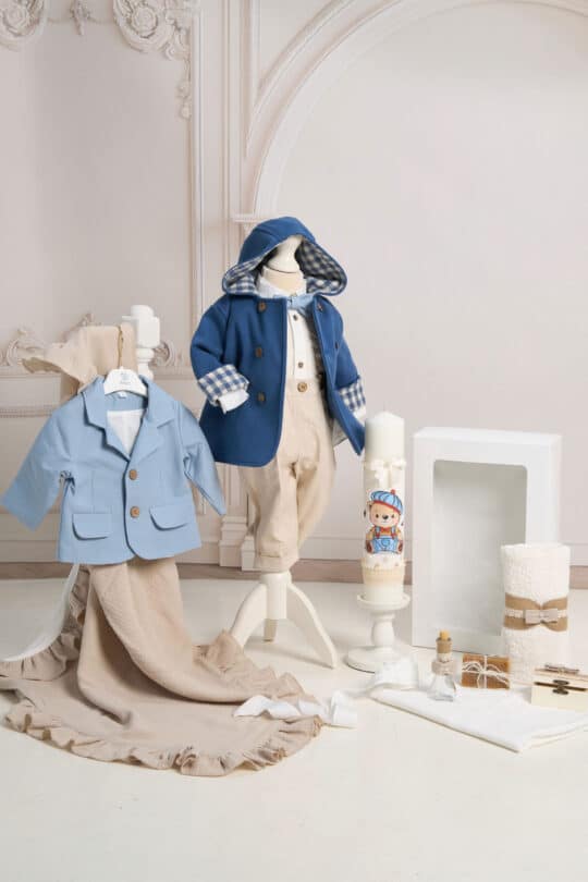 Set botez Theo gri bleu+ Jachetă Sky + Trusou + Lumânare