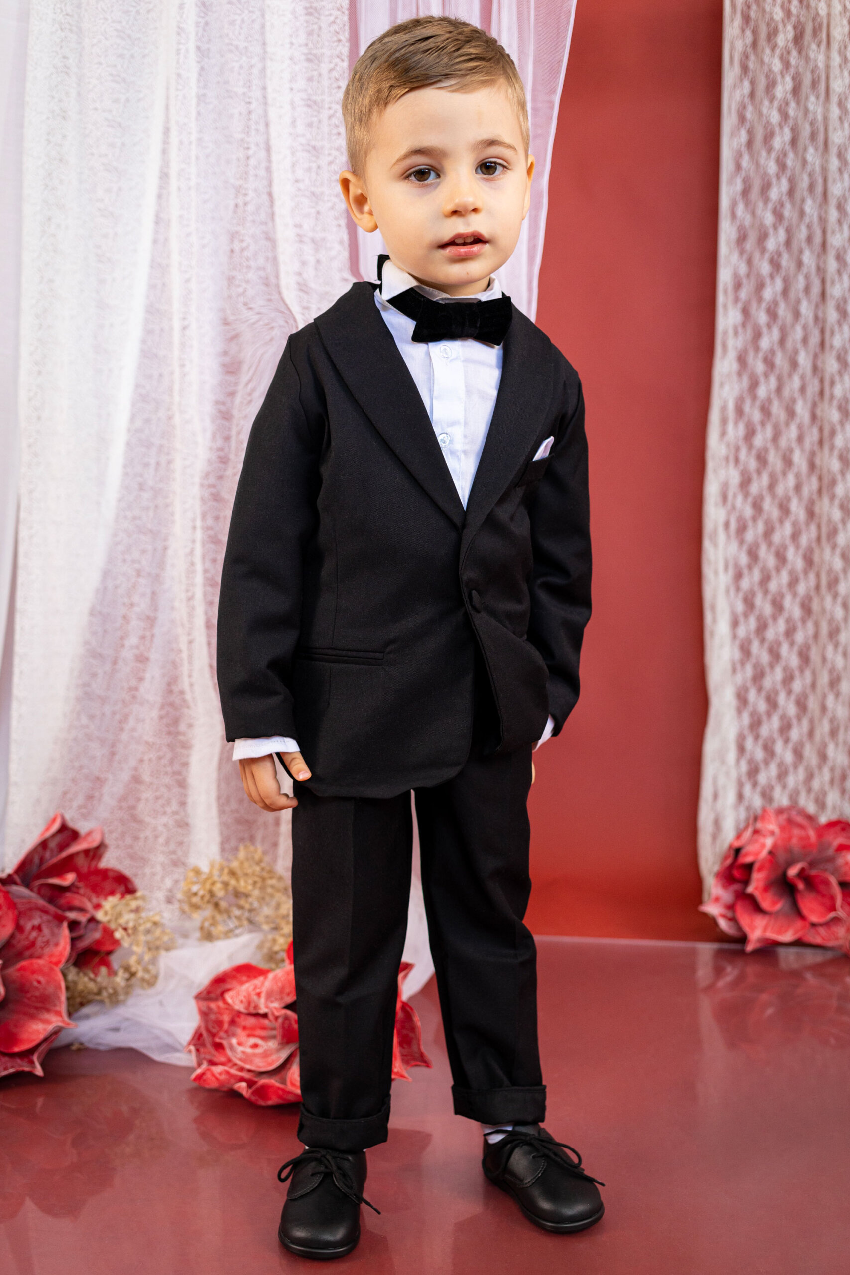 Costumul de botez și ceremonie conține 4 piese: pantaloni (stofă), smoking (stofă), cămașă (bumbac), papion(catifea)