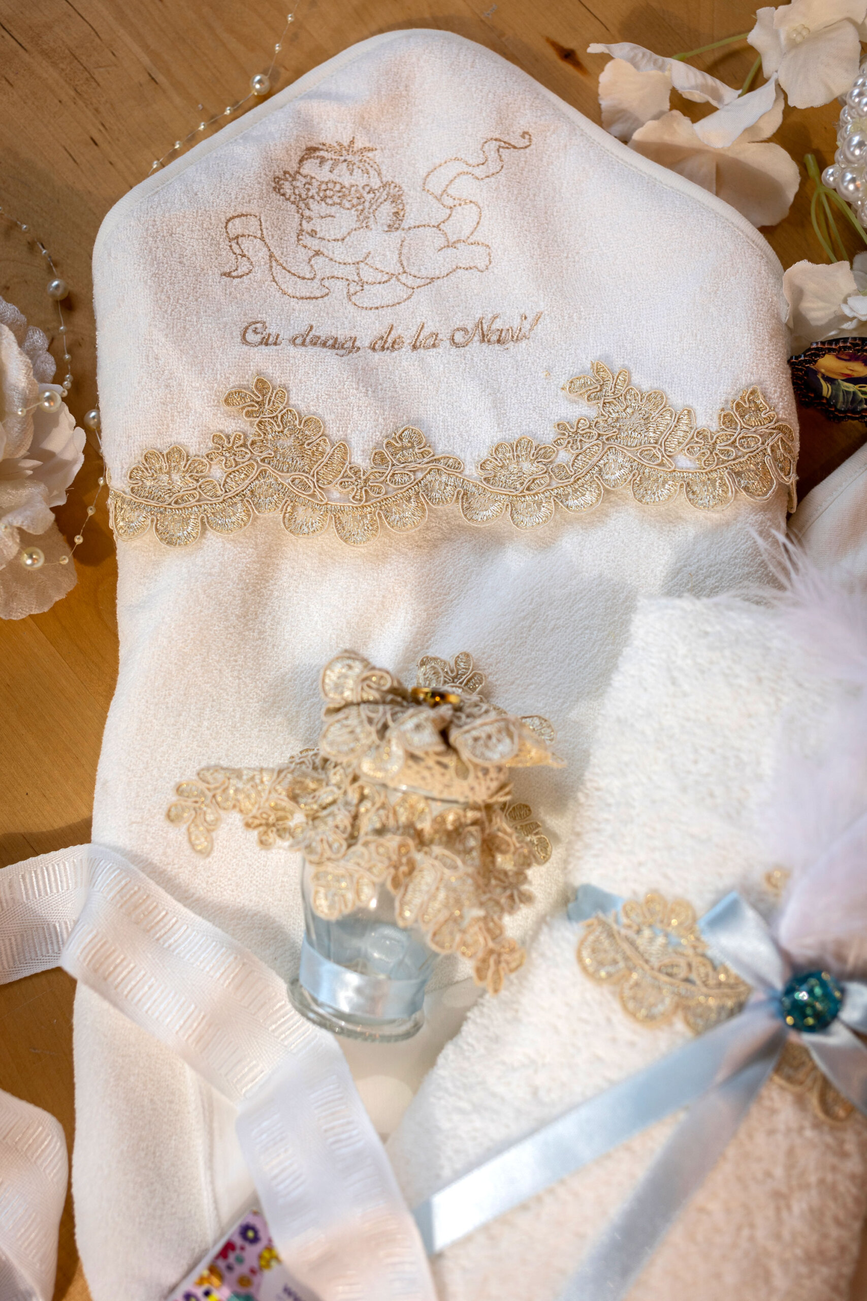 - Prosop cu capișon 82×82 cm – brodat cu îngeraș și “Cu drag, de la Nași!”