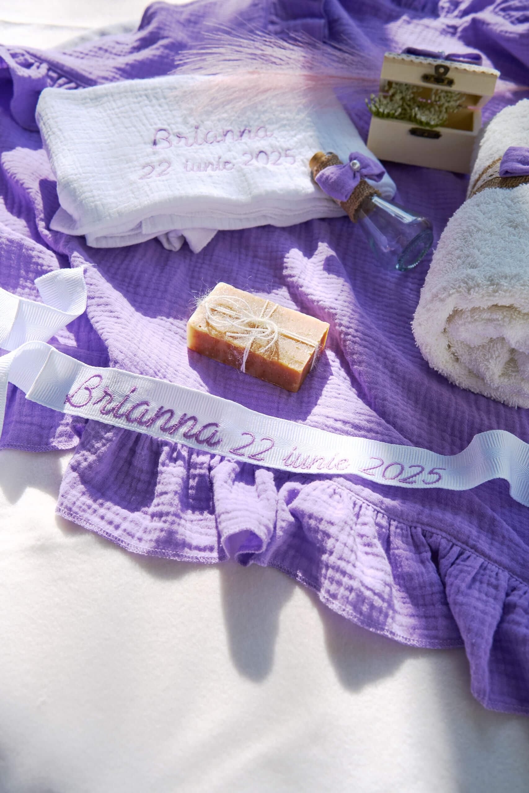 Cu un design simplu și rafinat, realizat din mușelină și bumbac de calitate, acest trusou adaugă un strop de puritate și binecuvântare în ziua botezului, reflectând iubirea divină ce însoțește începuturile bebelușului în această lume.