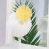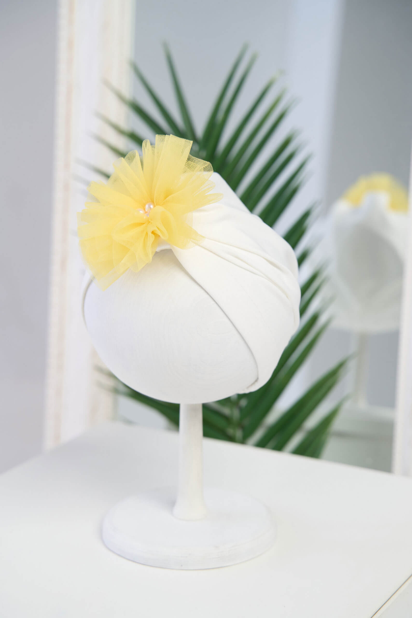 Turbănele din fond alb cu floare din multe straturi pufoase de tull cu perluțe accent în mijloc.