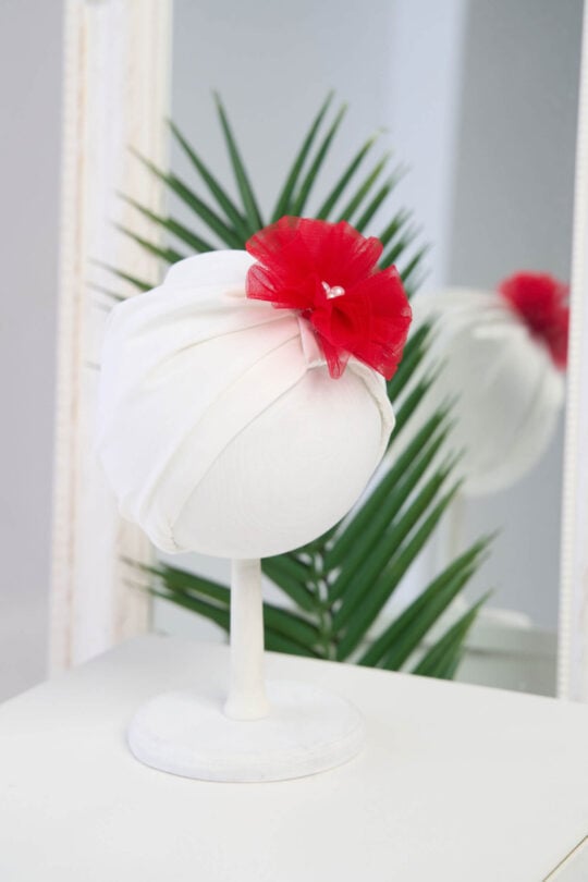 Turbănele din fond alb cu floare din multe straturi pufoase de tull cu perluțe accent în mijloc.