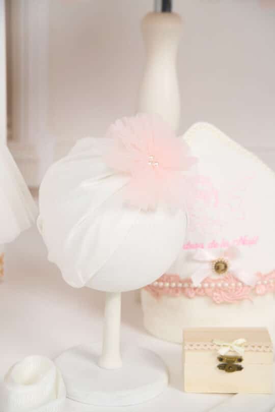 Turbănele din fond alb cu floare din multe straturi pufoase de tull cu perluțe accent în mijloc.