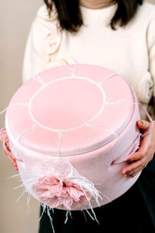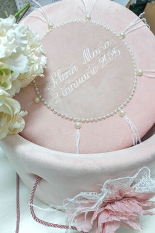 Cufăr botez FLOARE buretat din catifea pufoasă – roz