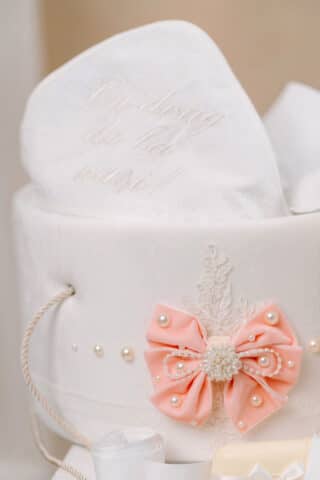 Pachet botez cu -20% REDUCERE – Cufăr buretat FLOARE ivoire + Trusou PureBebe