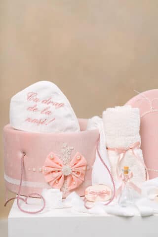 Pachet botez cu -20% REDUCERE – Cufăr buretat FLOARE roz+ Trusou PureBebe
