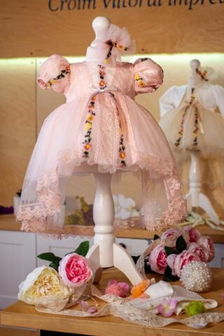 Rochiță botez cu trenă și tull brodat 3 piese